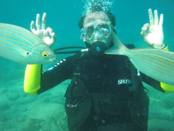 The fish are a lot more plentiful than I expect also. There are lots of bream, fairly colourful, and lots of urchins and anemones and smaller fish, but pretty too. I am amazed. The guys from the diving school are right by you at all times, and they take plenty of pictures too, which are of course available for a fee on disc afterwards. Sold! Sadly I am having problems getting some of the photos loaded from the disc at present, but here is one of them below – more to follow when I get the rest up and ready.