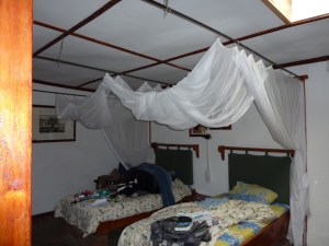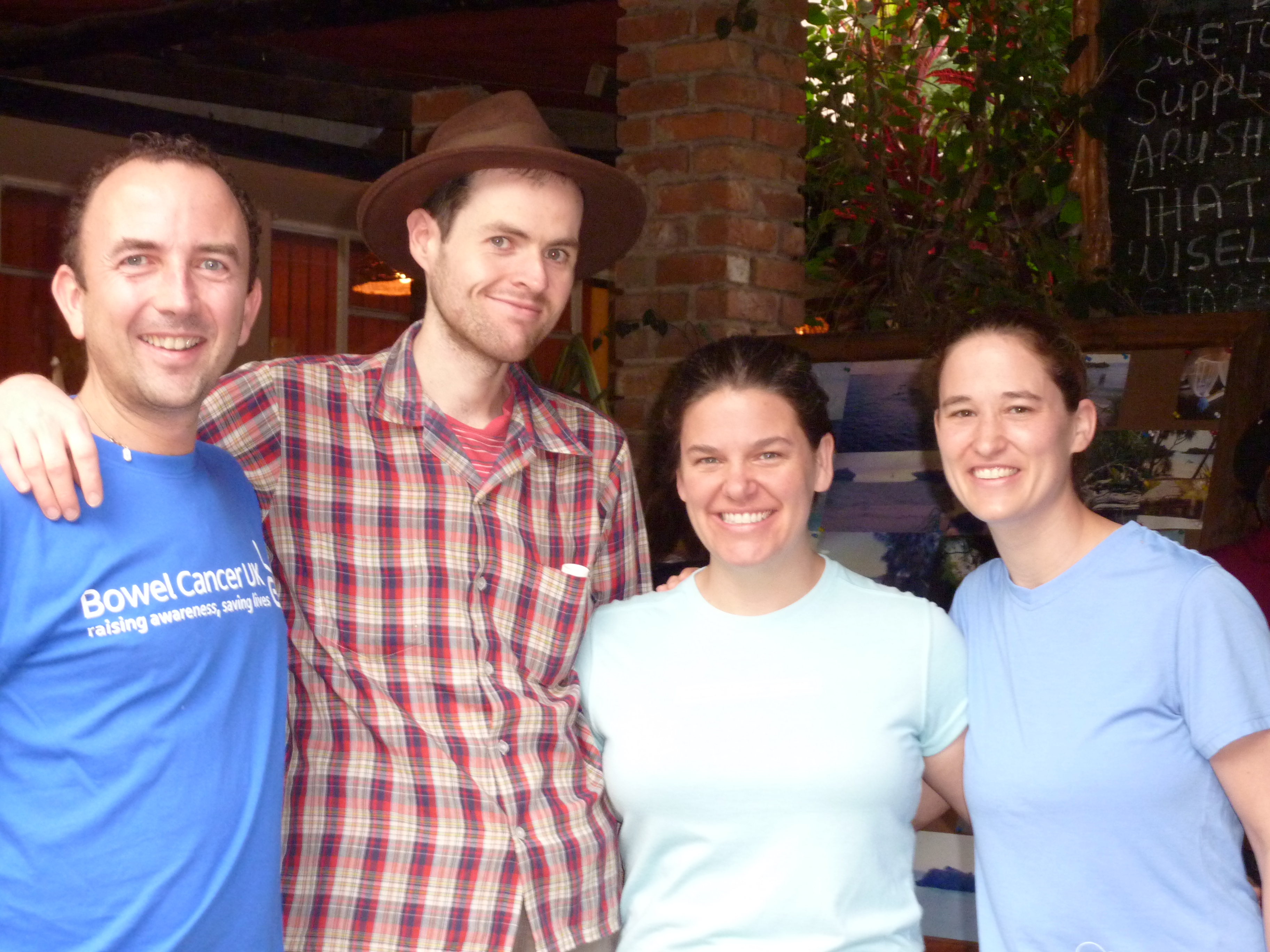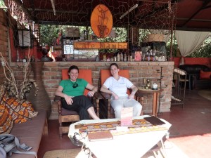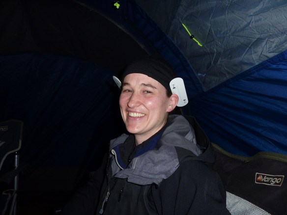 After getting to camp I feel pretty bad. My head pounds like I have been hit with a cricket bat, and I feel nauseous. The popcorn that I have been looking forward to sounds revolting, and I go and see Deo and tell him what is wrong. He says “take 500mg of Paracetamol”. Although I hate taking tablets of any kind, if he had said “take two kilogrammes of Paracetamol”, I would have done it. I just needed some relief. I went straight to my tent and slept instantly, like I hadn’t slept for a week. I was woken by someone for dinner, and ate it, feeling mildly less nauseous, but stilll headachy. It was all a bit of a blur really – I think we may have played cards (Yuker, which I learn afterwards is spelled “euchre” – thanks Caroline:)), and I think this may have been a picture of Heather after she had done some sort of barn door thing after winning or something: