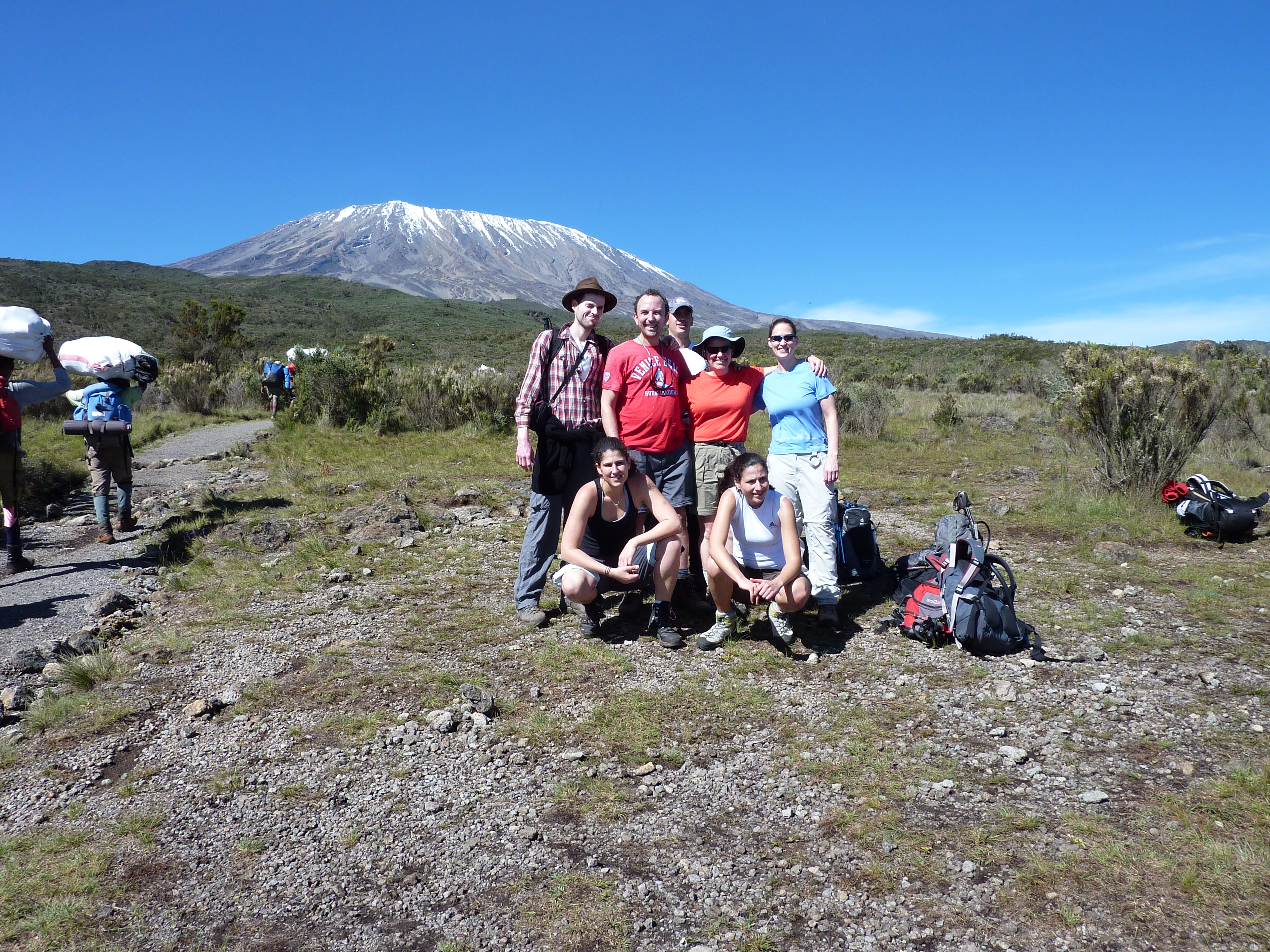 We are soon walking, and the weather is totally cloudless, and before long we are greeted with outstanding views of the summit (Kibo), and here is a picture of all of us together: