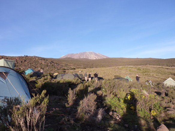 On the way to camp, Caroline introduces Heather and I to the Shocker (not literally I hasten to add). I think I should just leave it right there, and so I will:). By the time we get to camp it has been a long day already. I am starting to feel a headache coming on. Kikelewa is not pretty, but we do have great views of Mawenzi and also Kibo (seen below) in the distance: