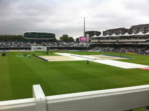 The rest of the day sort of happened in a similar vein really. There was a little bit of cricket inbetween, but actually only 12 overs in total, lasting about 45 minutes. My view of the pitch was a great one, being just at the edge of the pavilion/MCC balcony, but the pitch looked like this for much of the day:
