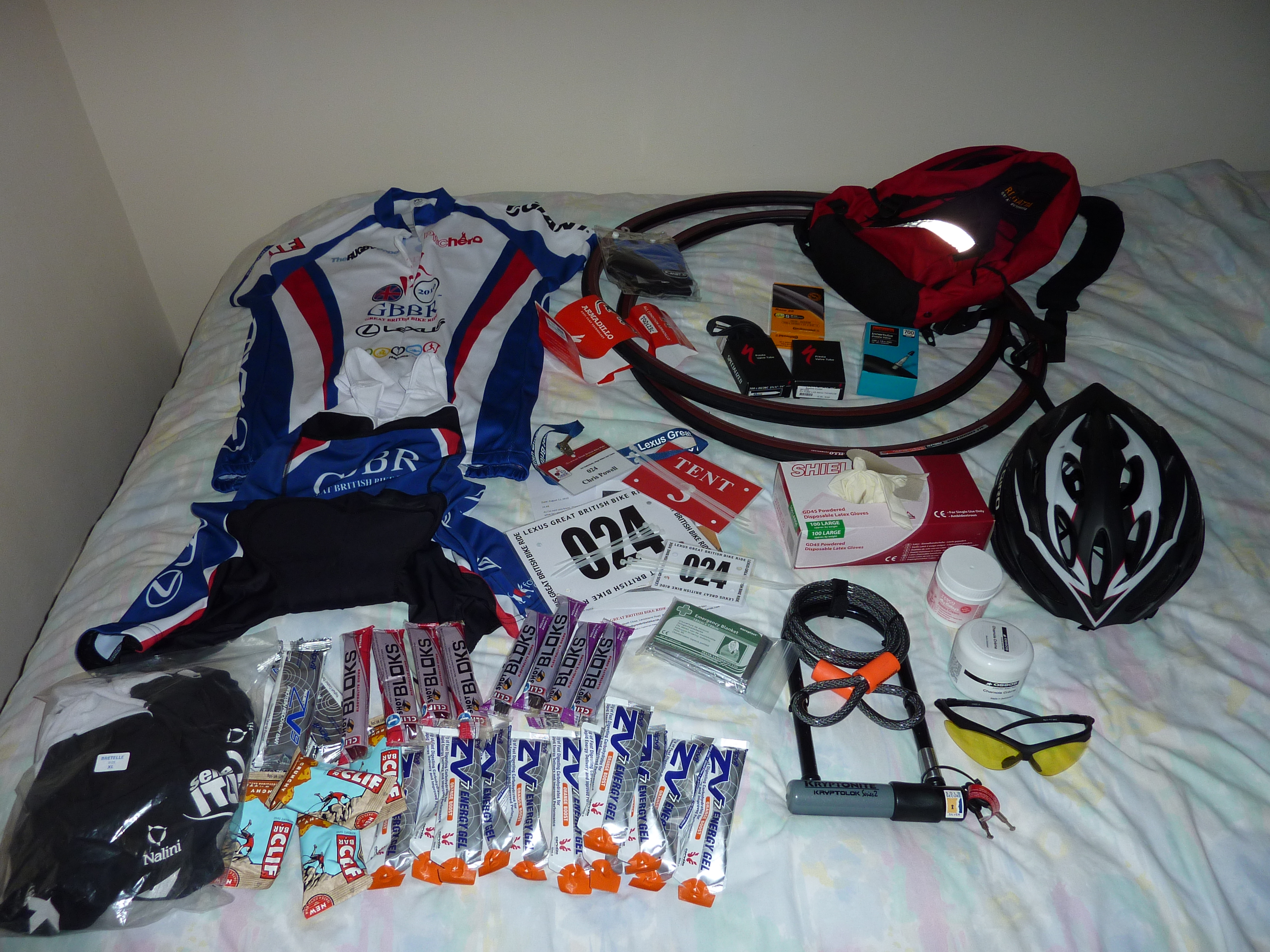 Assembled so far are just some of the things that I will need to have, but you will see that amongst the melee, some very exciting (little things please little minds and all that) things have arrived this week. Two of those were my GBBR cycling top and bib shorts, which I have to say look great. They also fit too, which is an even bigger bonus! You may also spot in there my rider number (024!), and tent number etc., which arrived with another information pack this week. One of the weight issues I am going to have is that my bike lock weighs about 3kg on its own, and so this is going to be very very tight all round.