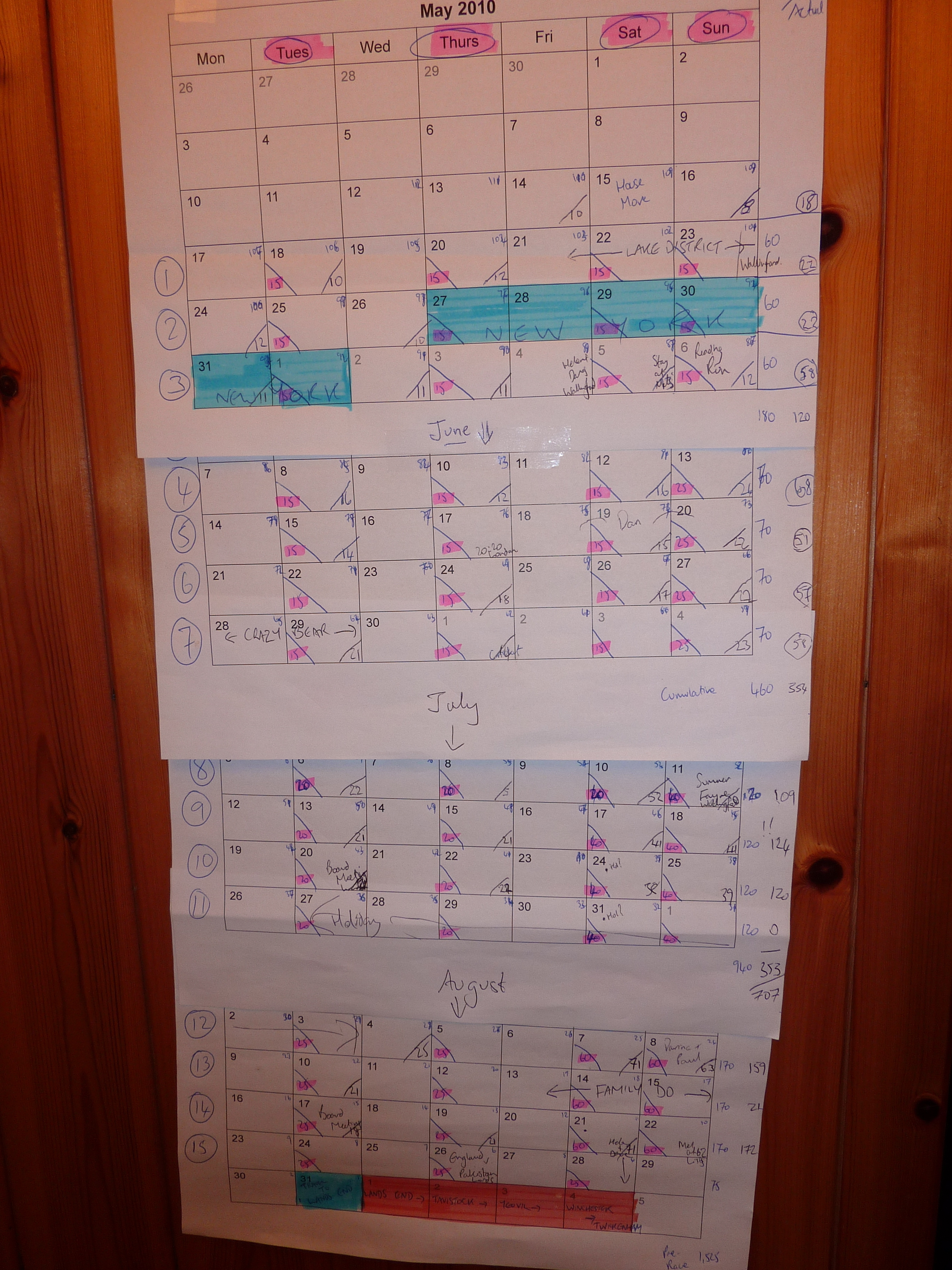 I have completed 172 miles this last week, and will cycle now every other day until Lands End for just 20 miles or so, and just ‘spin the legs’ as I have been advised to do. Hopefully it works, this is all unchartered territory for me. I mustn’t also lose sight of the fact that I did badly overall in my training schedule. I don’t know how well you can see this below, but here is my somewhat childlike wall chart that I have been keeping going for the last fifteen weeks or whatever it is. I think it shows, amongst other things, that I achieved my weekly target just three times out of fifteen: