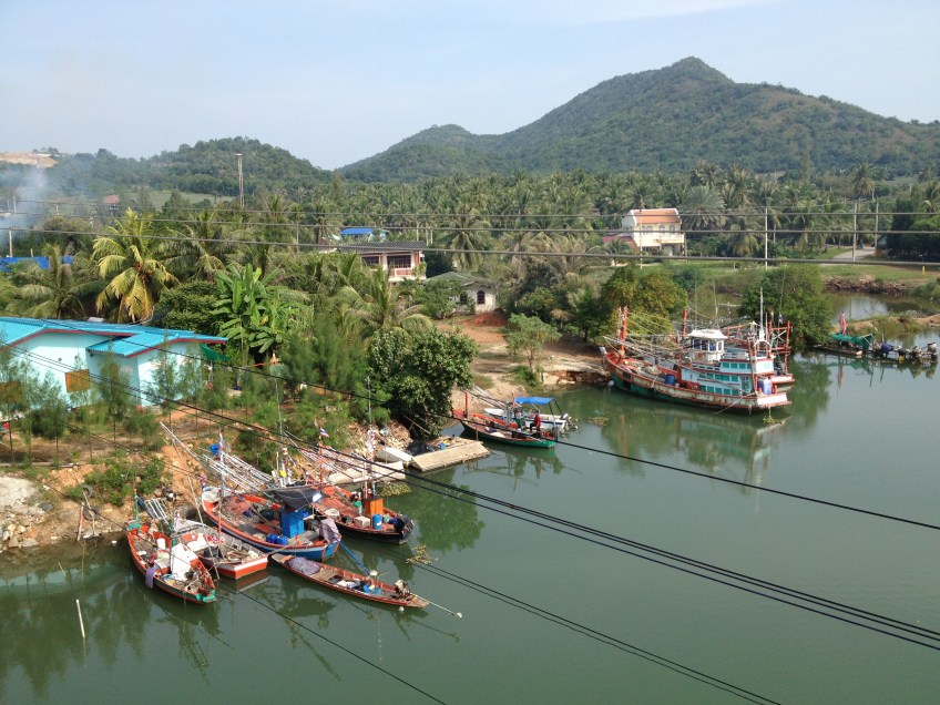 IMG_2998 Published December 17, 2012 at 3264 × 2448 in Day 2 – Hua Hin to Prachuap Khiri Khan Thai fishing boats from a bridge over the river.