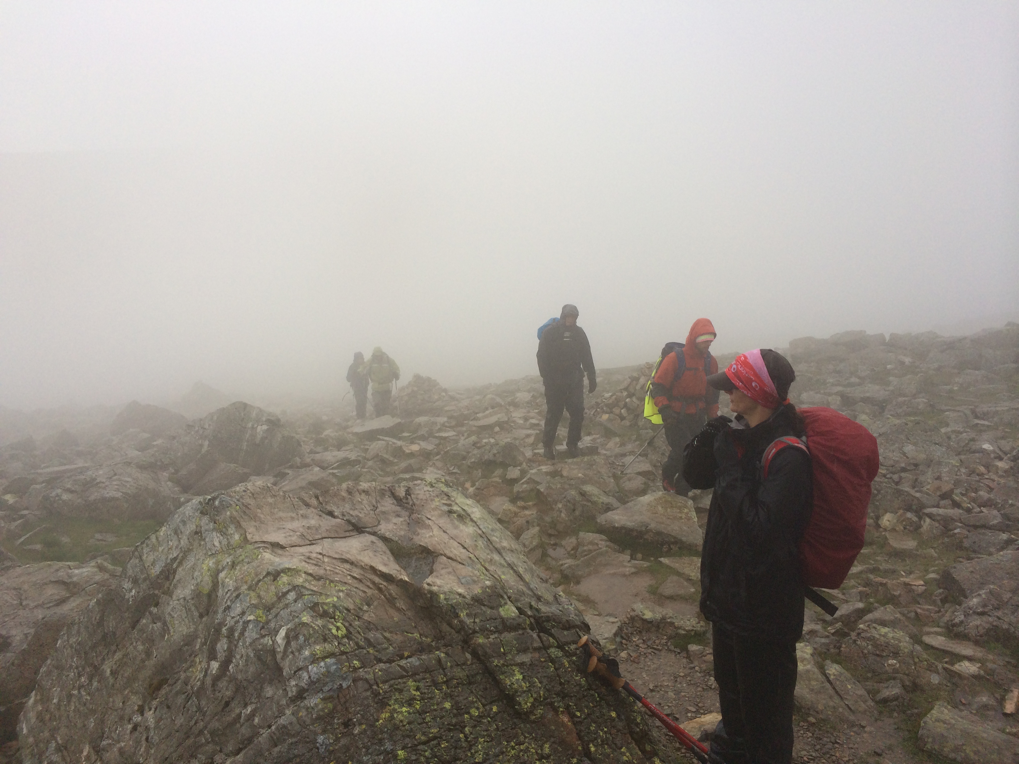 Amazingly when we reached the gully just before the approach to the summit of Scafell Pike, the clouds suddenly lifted. Kate told us it was all due to ‘orographic lifting’ or something like that. Whatever it was, it was very strange, but very welcome, and we got to summit peak number 7 of the day without precipitation, and a part view to Wasdale Head way below. The view for me was significant, as in two weeks’ time I’d be approaching by that route in the middle of the night during the Three Peaks Challenge. I was already wishing that I only had three peaks to face this weekend, instead of another 16 being as wet as I already was.