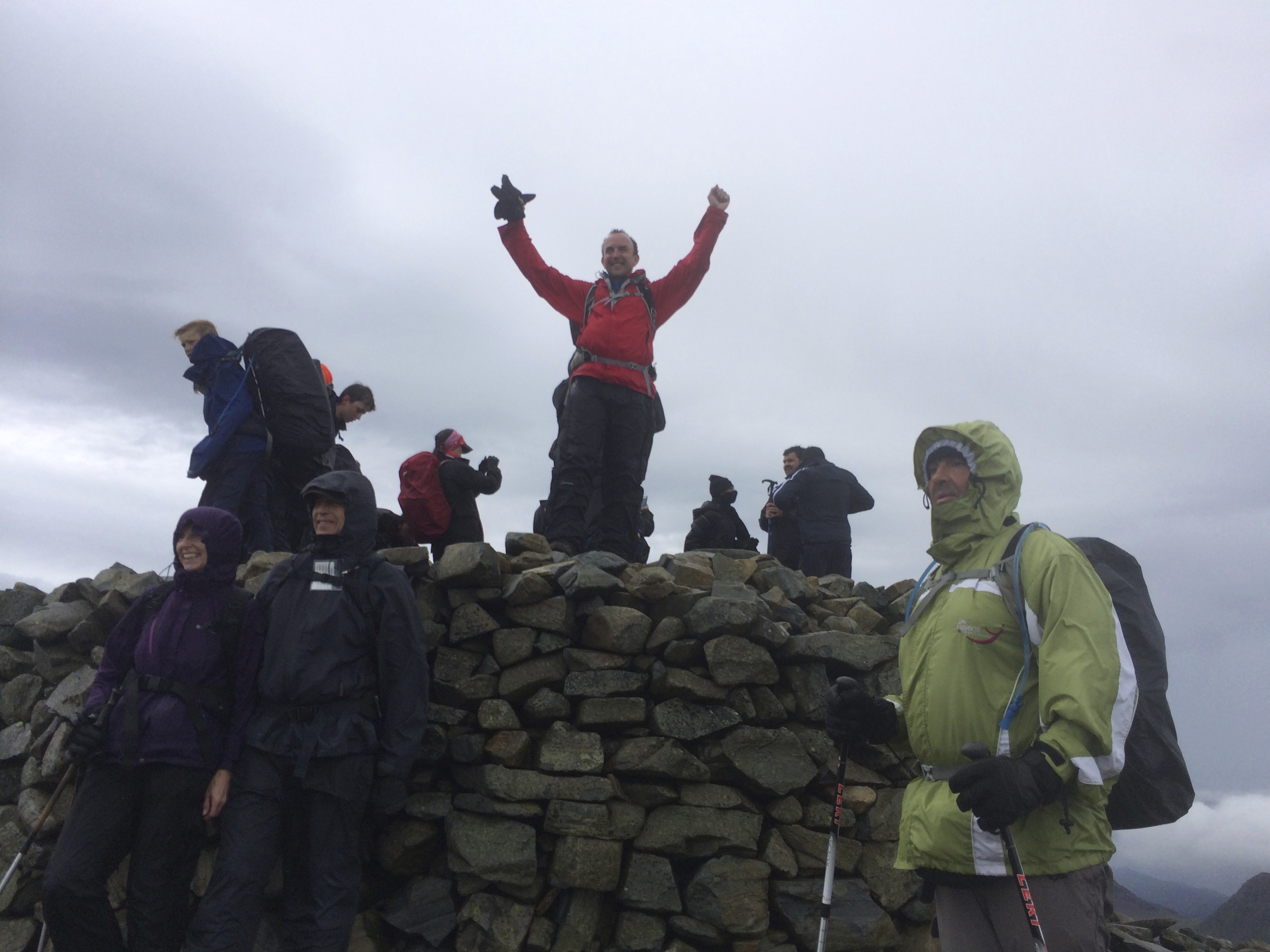 Summit of Scafell Pike (excuse the slightly over the top celebration!), Peter, Margaret and Sener in foreground.