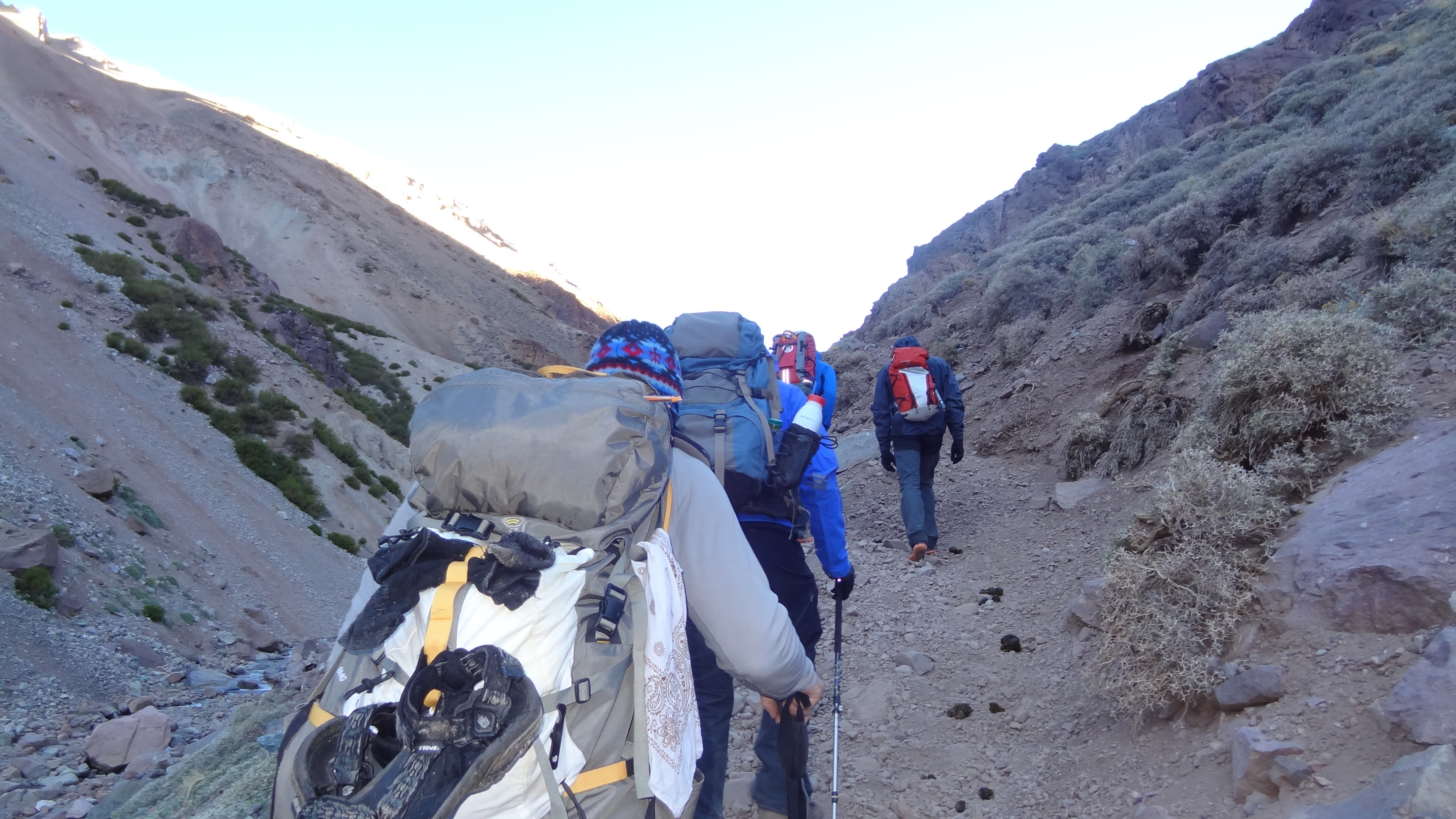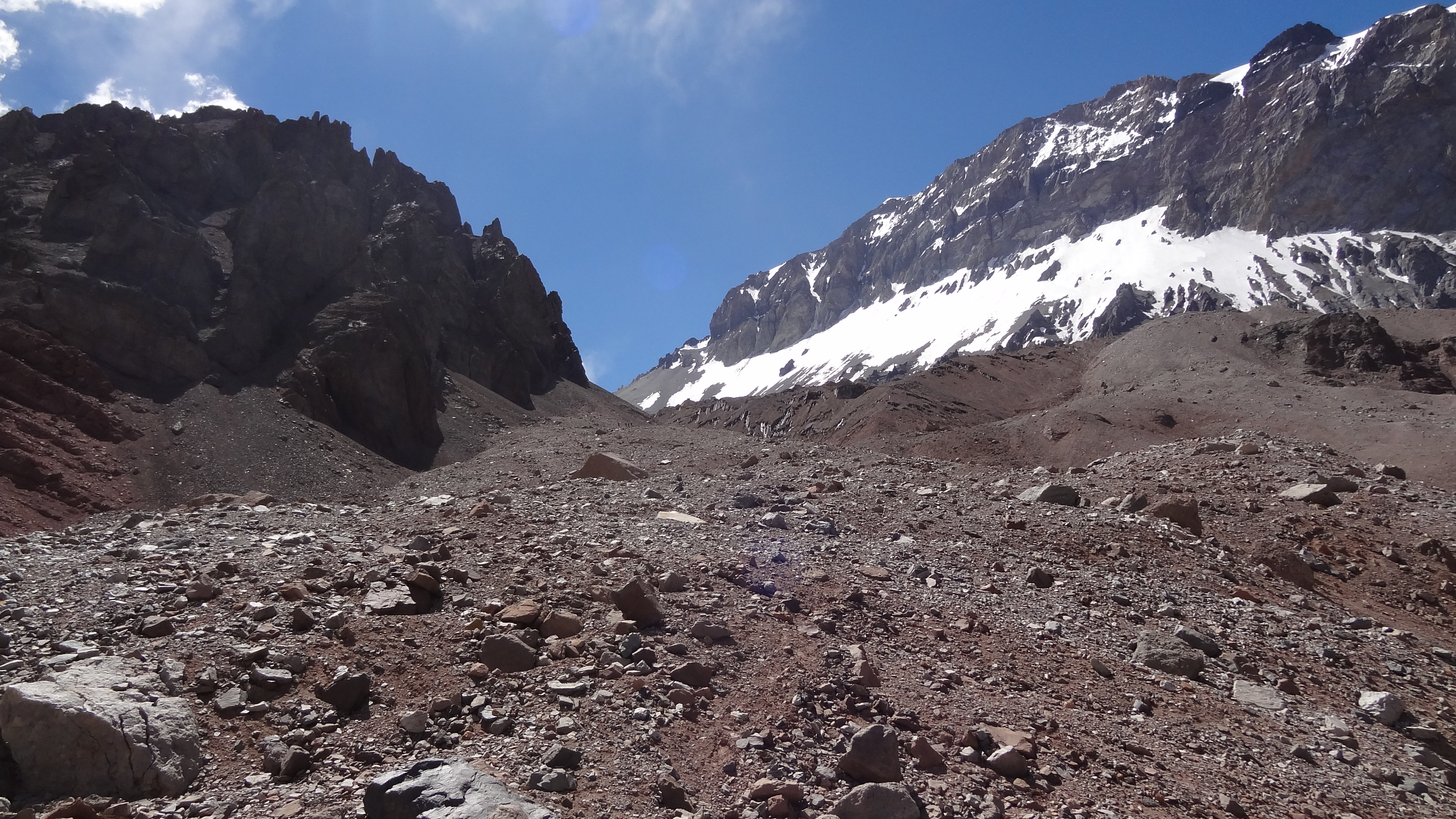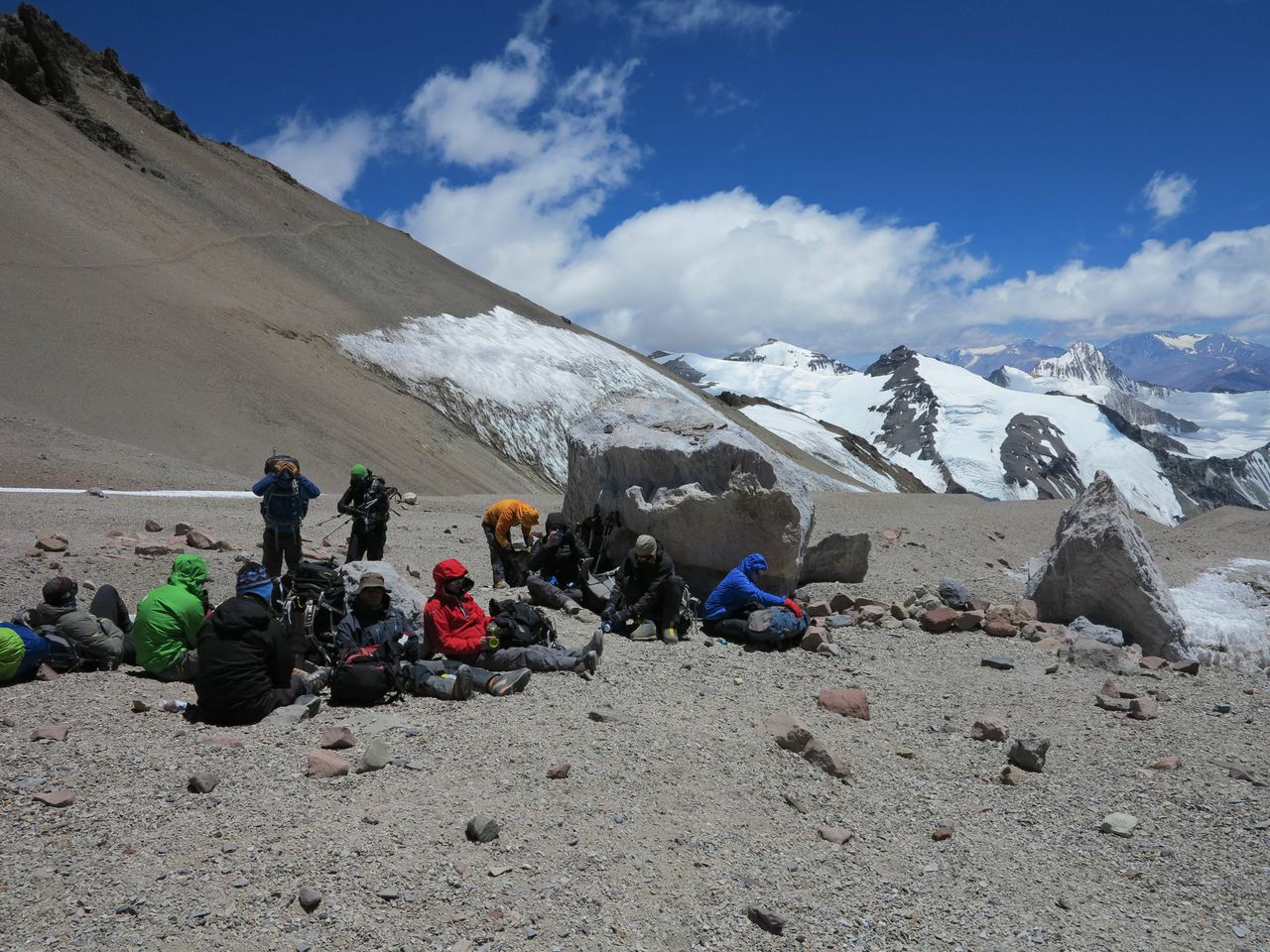 Setting out with three layers on my legs and four on top (including Goretex shell) the going was hard from the start, but well paced so as to keep us moving. By our first rest break we got a fantastic view of part of Aconcagua’s summit (it isn’t visible at all from Camp 1) and the severity of the mountain really hit us all. We were still two whole vertical kilometres from its upper reaches, and it looks nothing at all up close like it does on any picture I have ever seen of it.