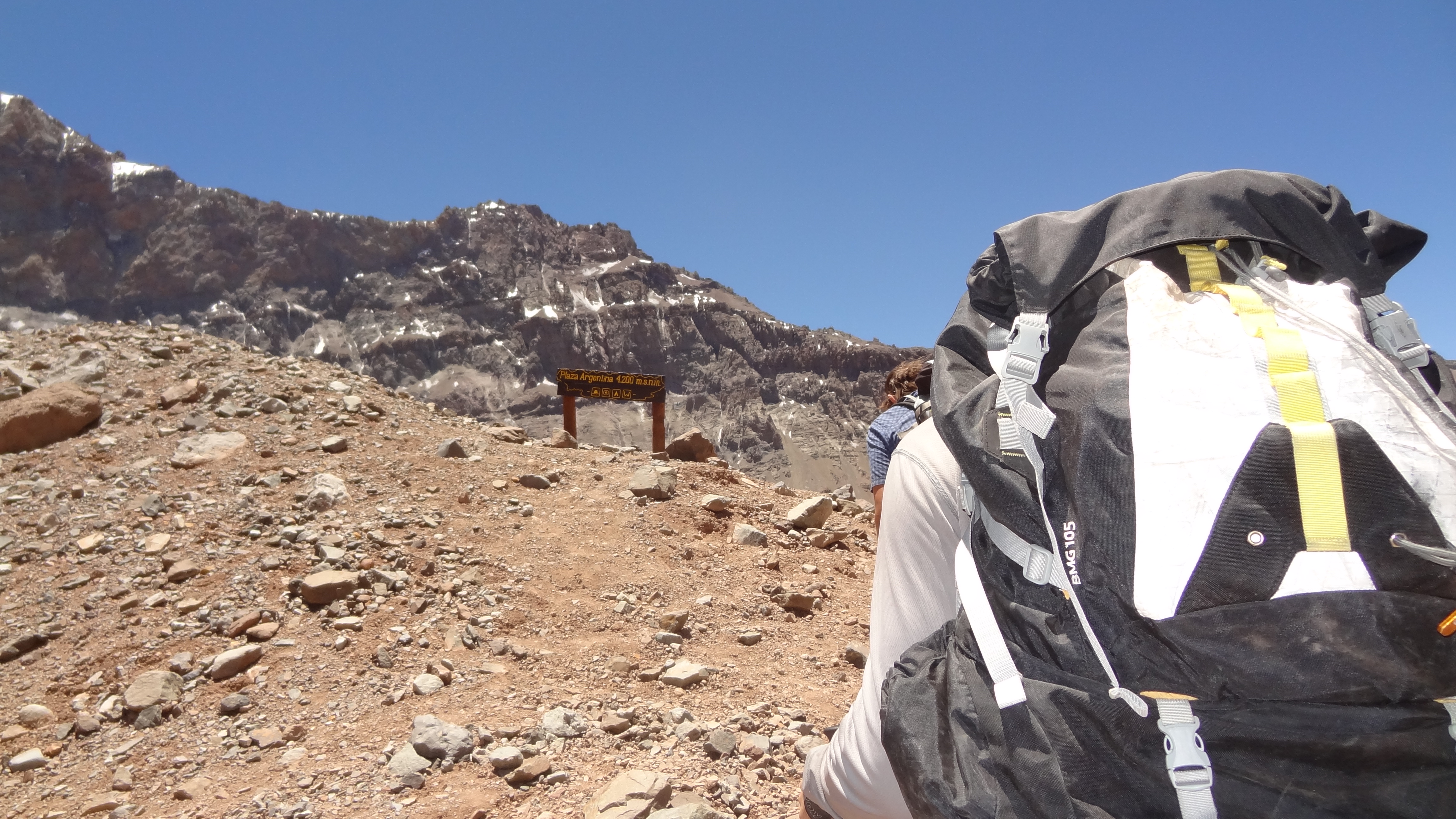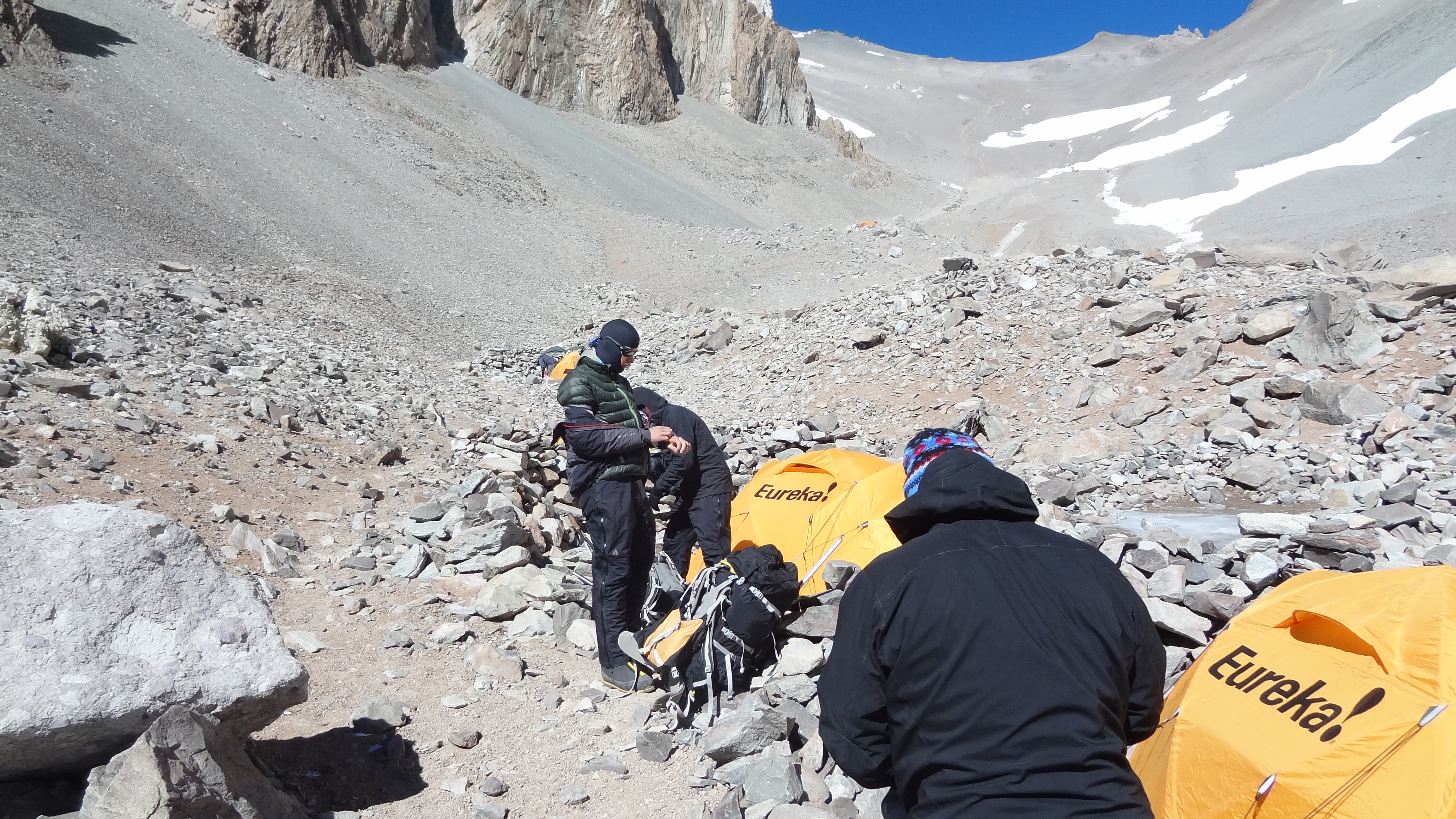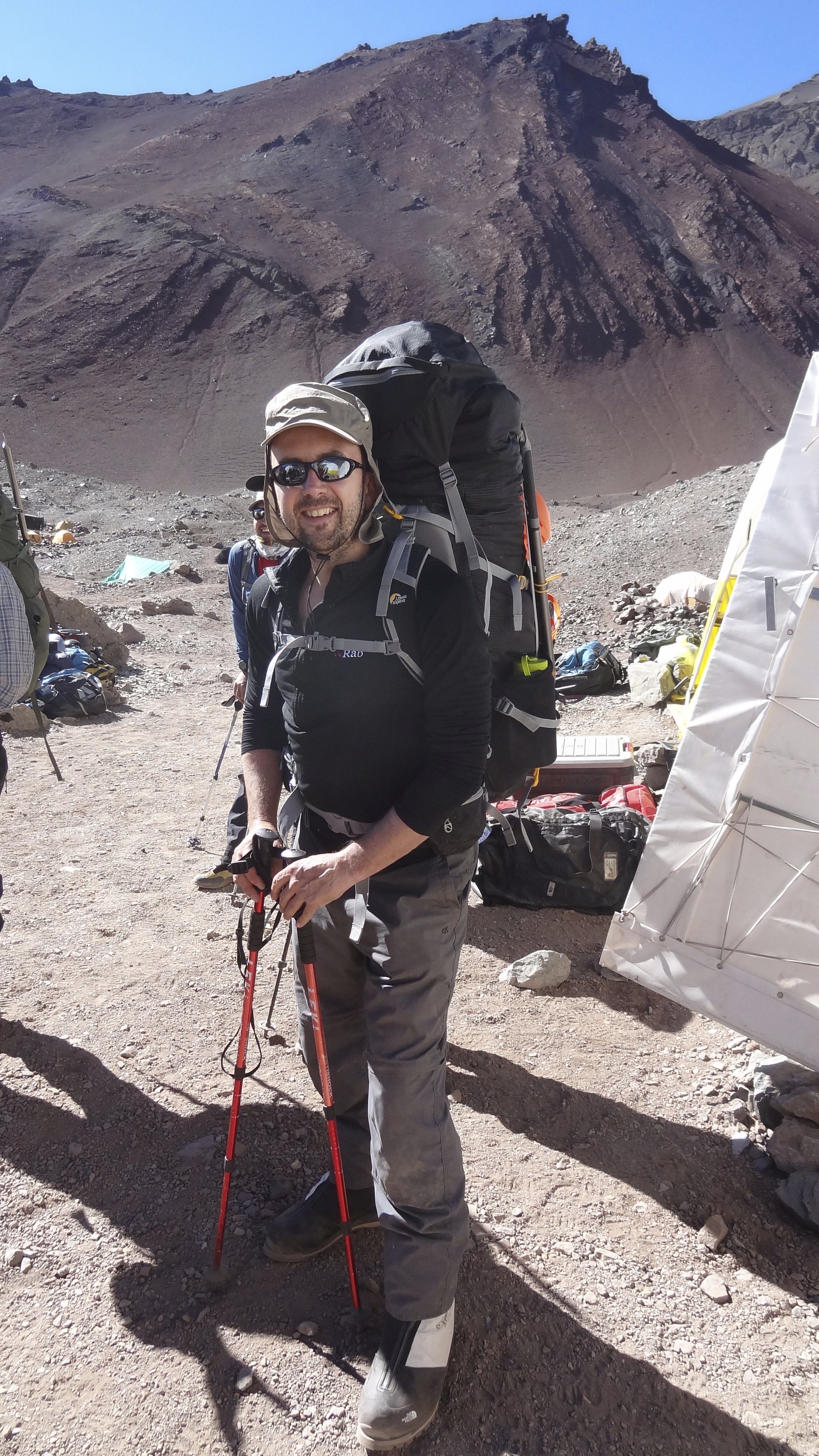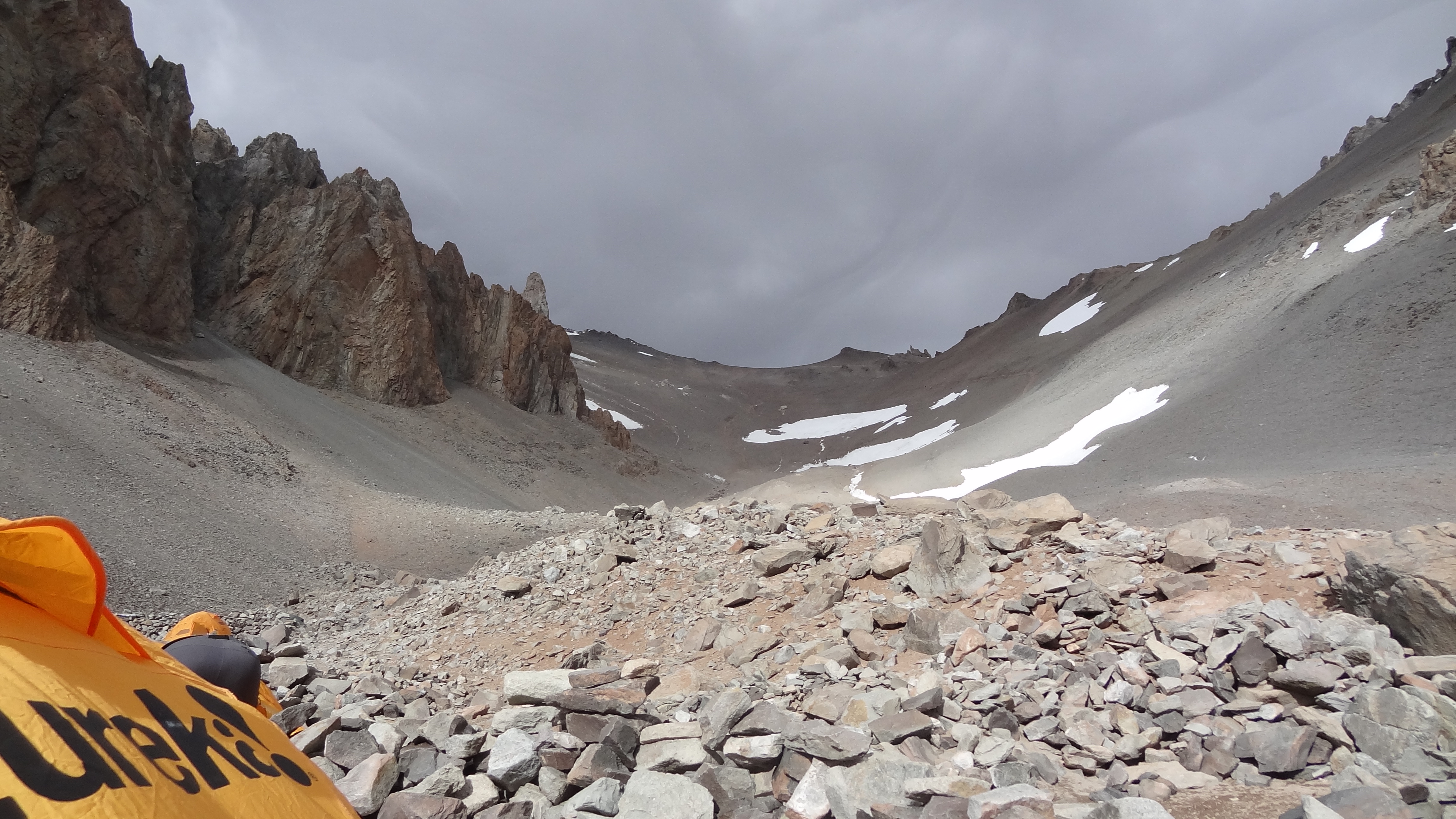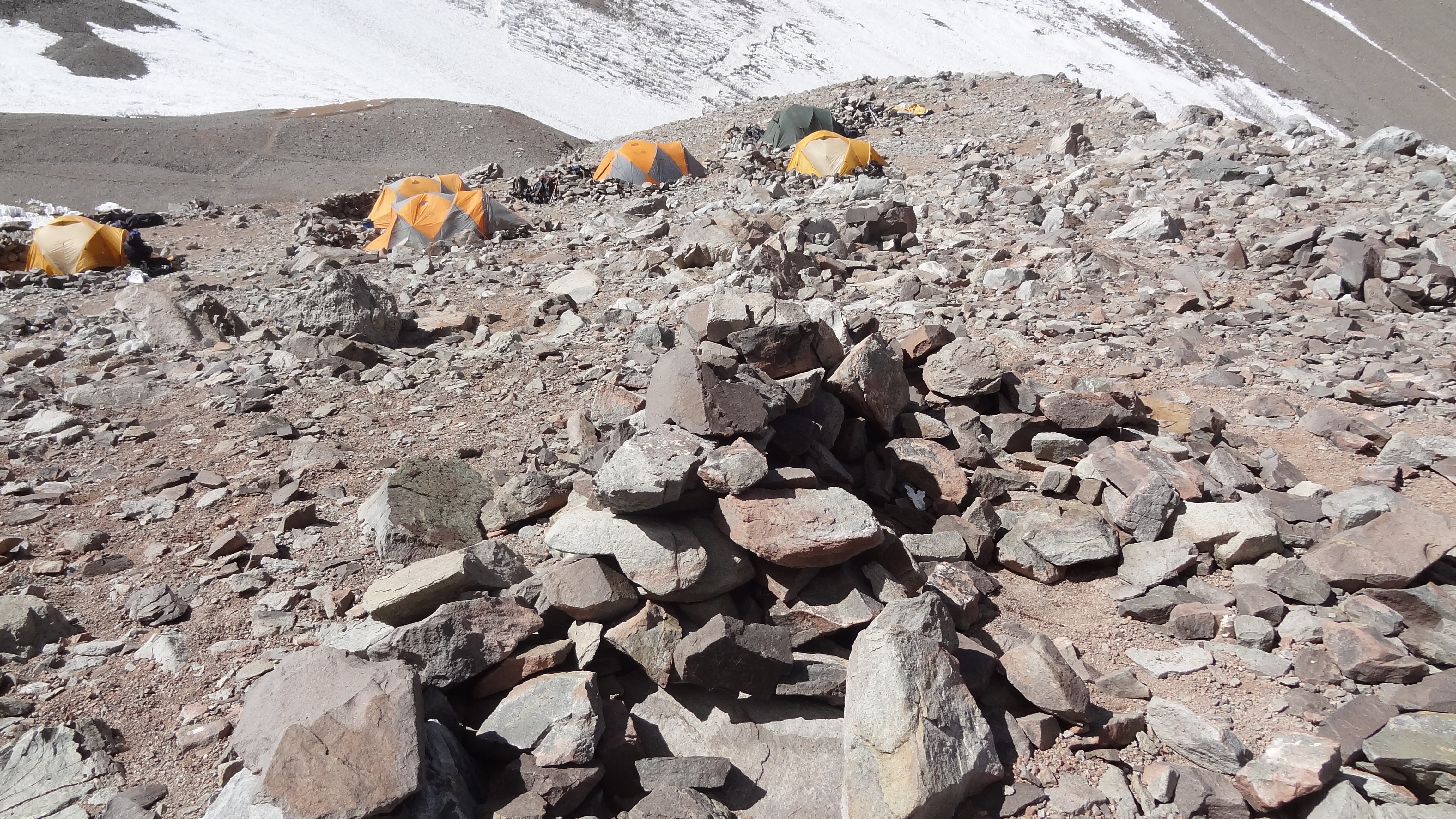 After a lunch break below the glacier we began the final climb up to Camp 2. The wind was howling and my hands were cold even in ski gloves. This mountain is really unforgiving. Towards the top of the slope I began to get dizzy. I felt a bit like I had when I had the HACE episode on Elbrus this August, if not quite as bad. I stopped, waved everyone else by me, and was attended to by Johnny and Tincho. They were great, calmed me down, got me deep breathing, and took my Sats. My pulse ox was 74, which they said wasn’t too bad, and after a further examination they took probably 18 of the 20kg in my backpack off me, and said I was good to continue if I so wanted. I did, not at any cost, but I felt ok enough to carry on slowly.