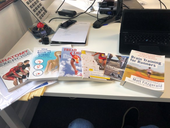 I’ve also had some great help from a work colleague, Esther, with whom I run with at lunchtimes at work from time to time. Esther has done a great job of encouraging other people in our office to get from the couch to do a half-marathon, and sacrifices a lot of time and her own running time to do so. That’s really as inspirational as it is admirable, and she is also already helping my journey too. Yesterday she brought into the office a veritable library of books for me to borrow, dealing with almost every aspect of running, from the physical to the theoretical, the down and dirty to the esoteric. and as I have a thirst for knowledge I could be buried in books for some time……….:)