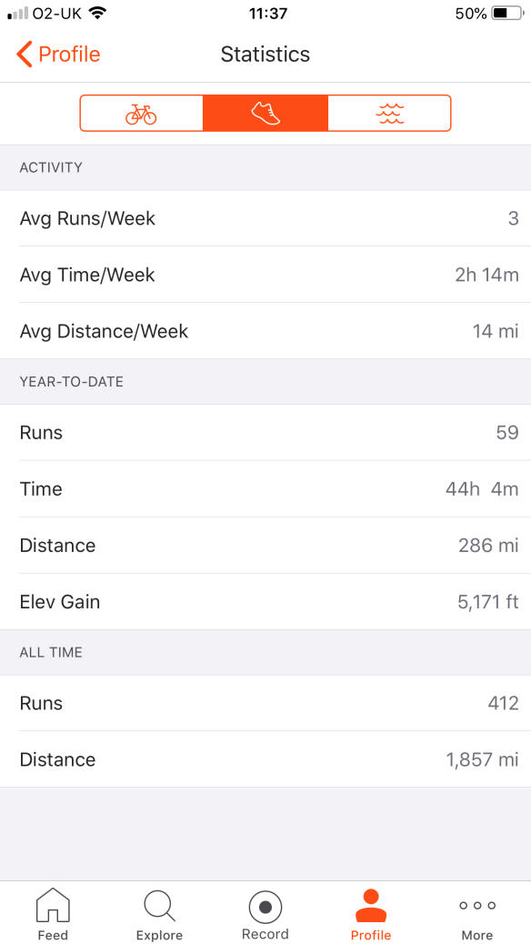 I cannot however bury myself in theory for too long. While it is important, there is nothing to beat getting out there. Strava tells me that I have run 268 miles this year so far, which is a (not bad for me) 14 miles a week on average. I’m currently (the last two or three weeks) at about 20 miles a week, which whilst a decent base, is nowhere close to what I will need to be running in order to get myself over the finish line.