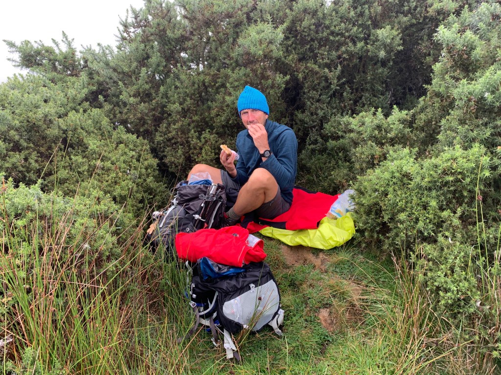 Leaving the woods behind we once again made our way over our final moorland, which would take us all the way to the sea. The rains came for our final packed lunch of the trip and we found shelter in some gorse and heather albeit briefly.