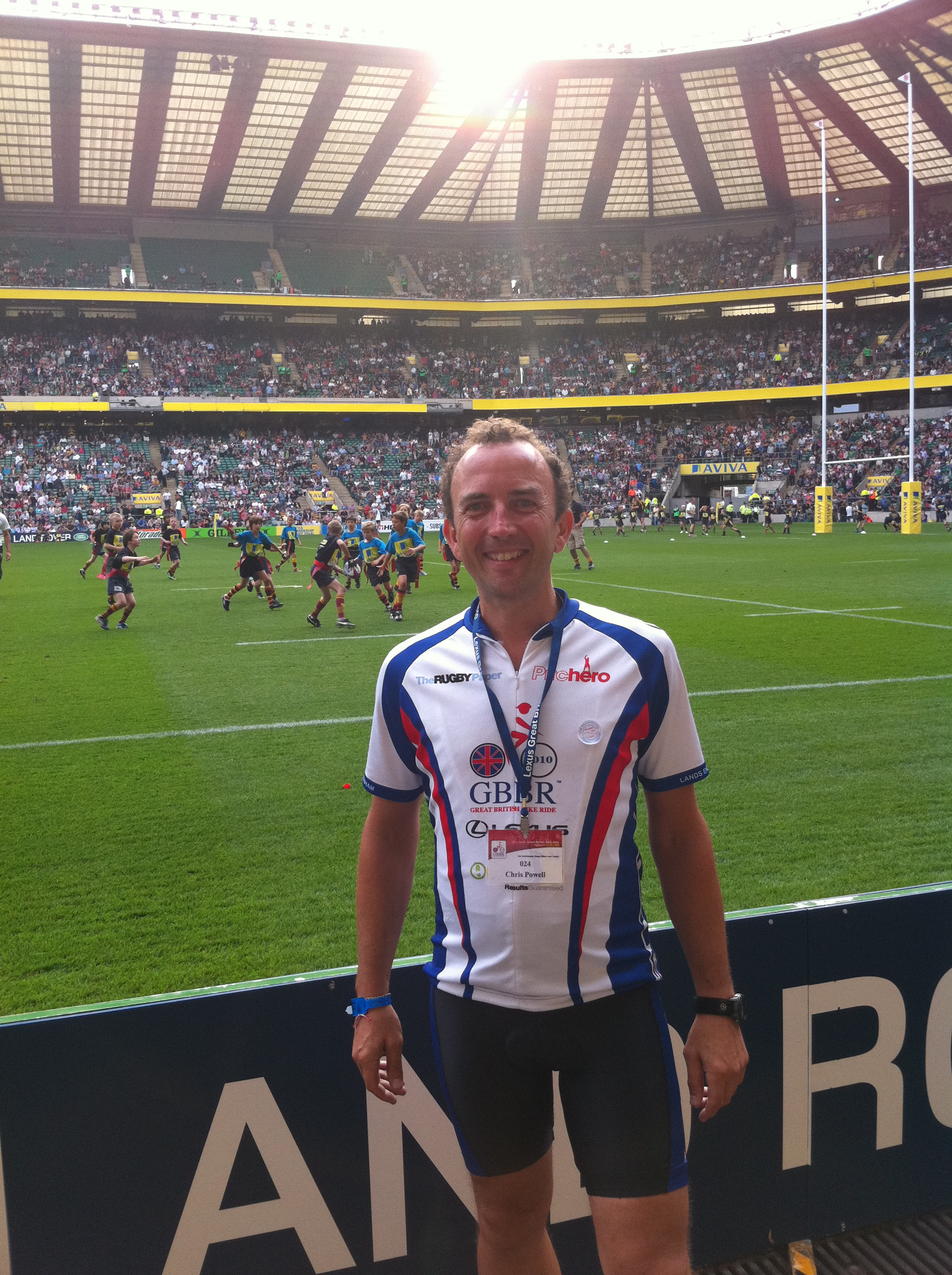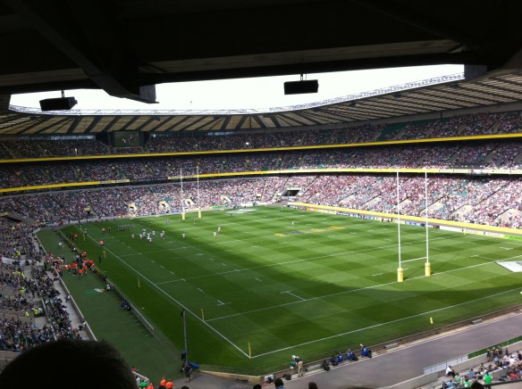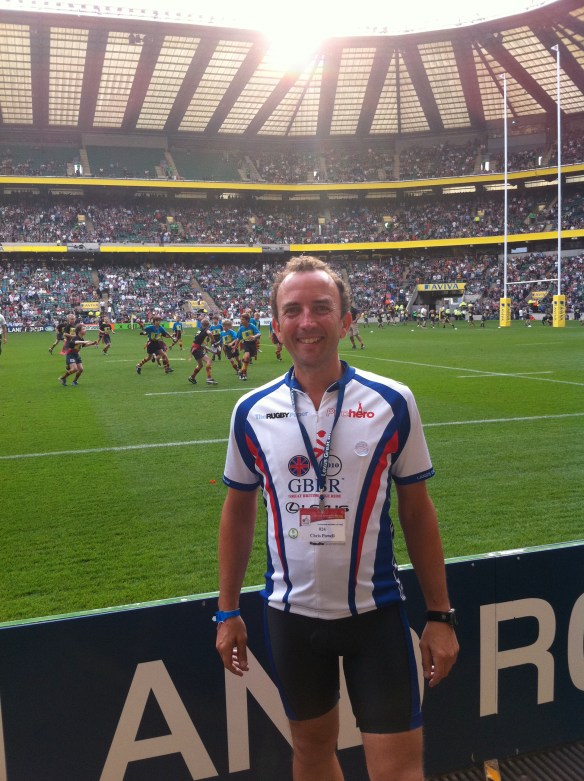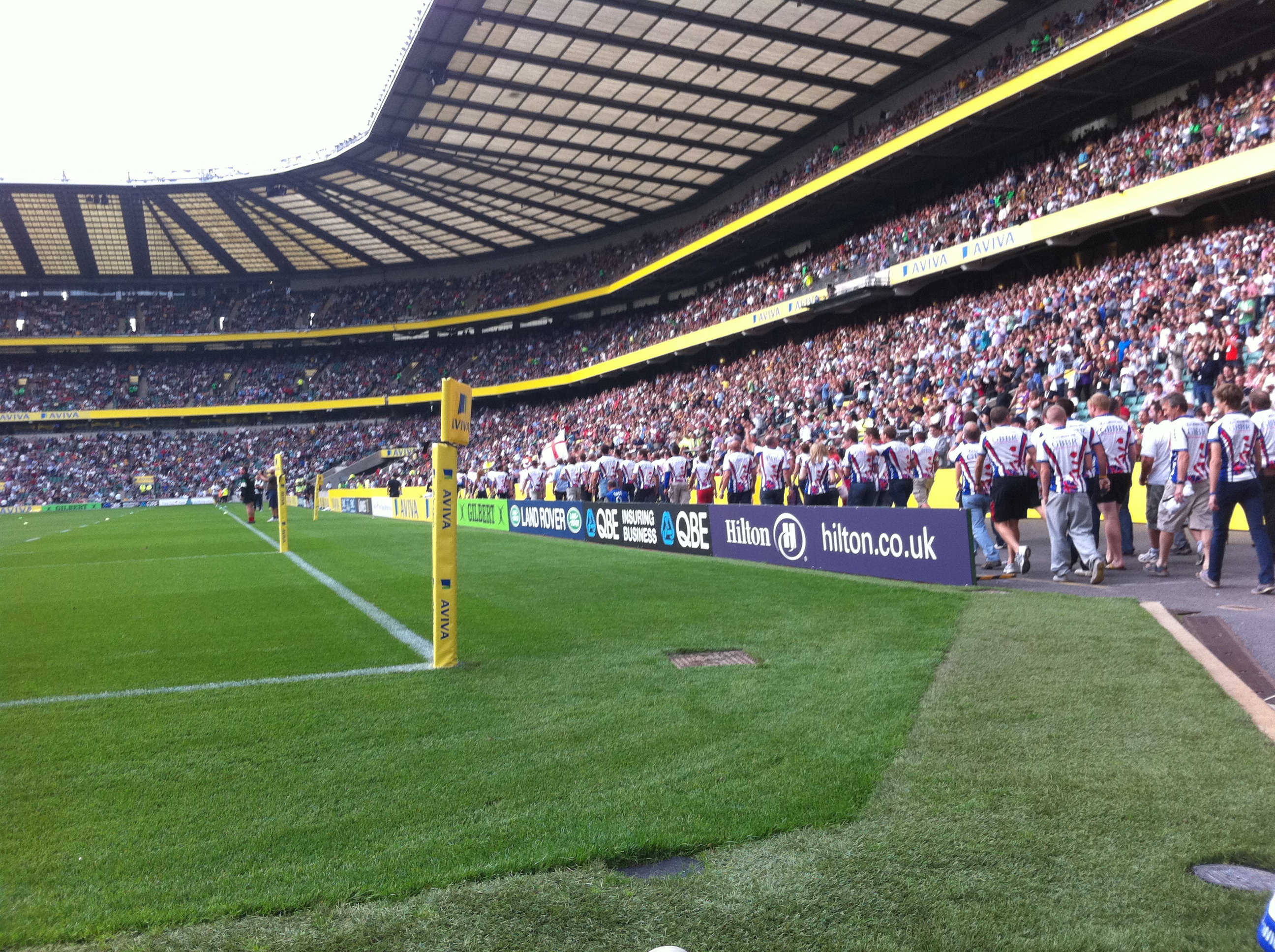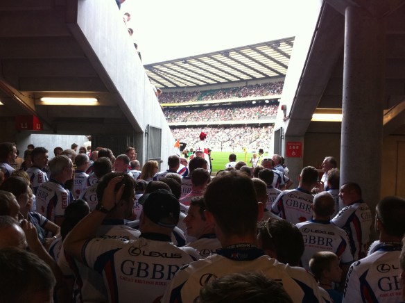 After a nice rest at the rugby stadium, during half time of the second rugby game, we were all led around the pitch itself by Richard Hill. Twelve cyclists got to ride around the track, the best thing being that Pete’s Dragons were amongst them, the most deserving people of all in my opinion. To walk around the pitch was very emotional – there were officially 75,112 people in the crowd, and they were very receptive (unlike some other half time audiences the likes of which you would see at a football game), and applauded us literally all of the way round. I had a lump in my throat the whole way.