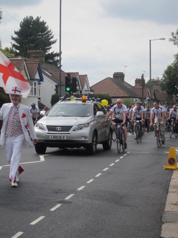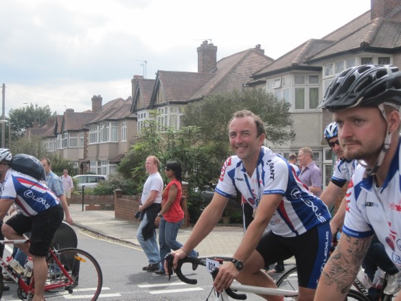 And the next one is of me as part of the group above. I think it is the only picture of me actually cycling that I have, which considering I have done over 1,500 miles this summer, is a shame, especially as I don’t even have my helmet on (well it was only three hundred yards, not that that is an excuse). It felt fantastic to know that I, all of us, had done it. Moreover, I was safe, no injuries or mishaps along the way. It felt great.
