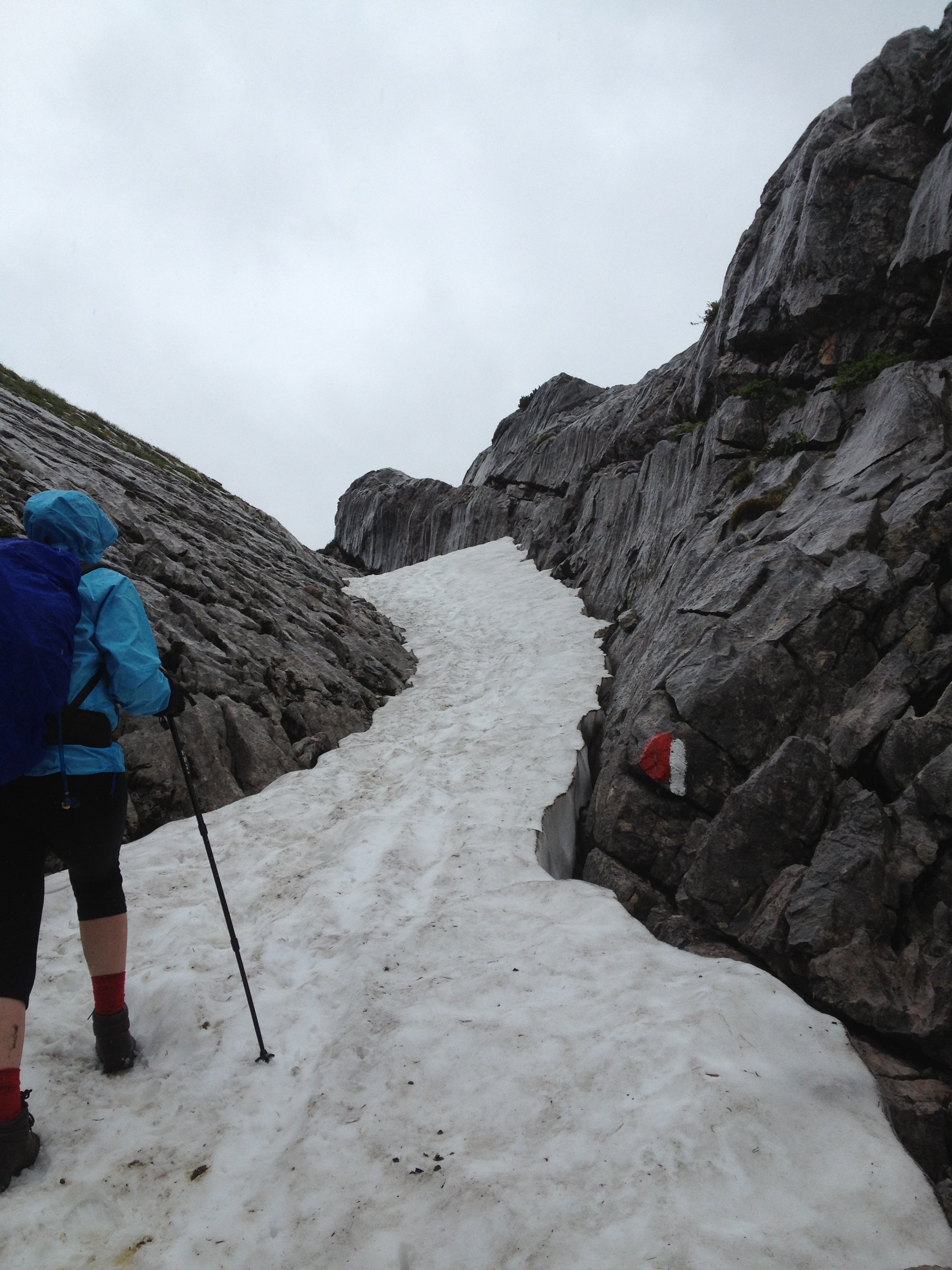 We sat in the Riemannhaus for probably an hour and a half, dried out, drank more black tea, and contemplated next steps. Our proposed destination that night was another hut called the Ingolstaedterhaus, which would involve another three or four hour climb through the wet and wind, and on snowy ground. Alternatively we could stay where we were, in the warm, and be safe. It was not an easy decision…………