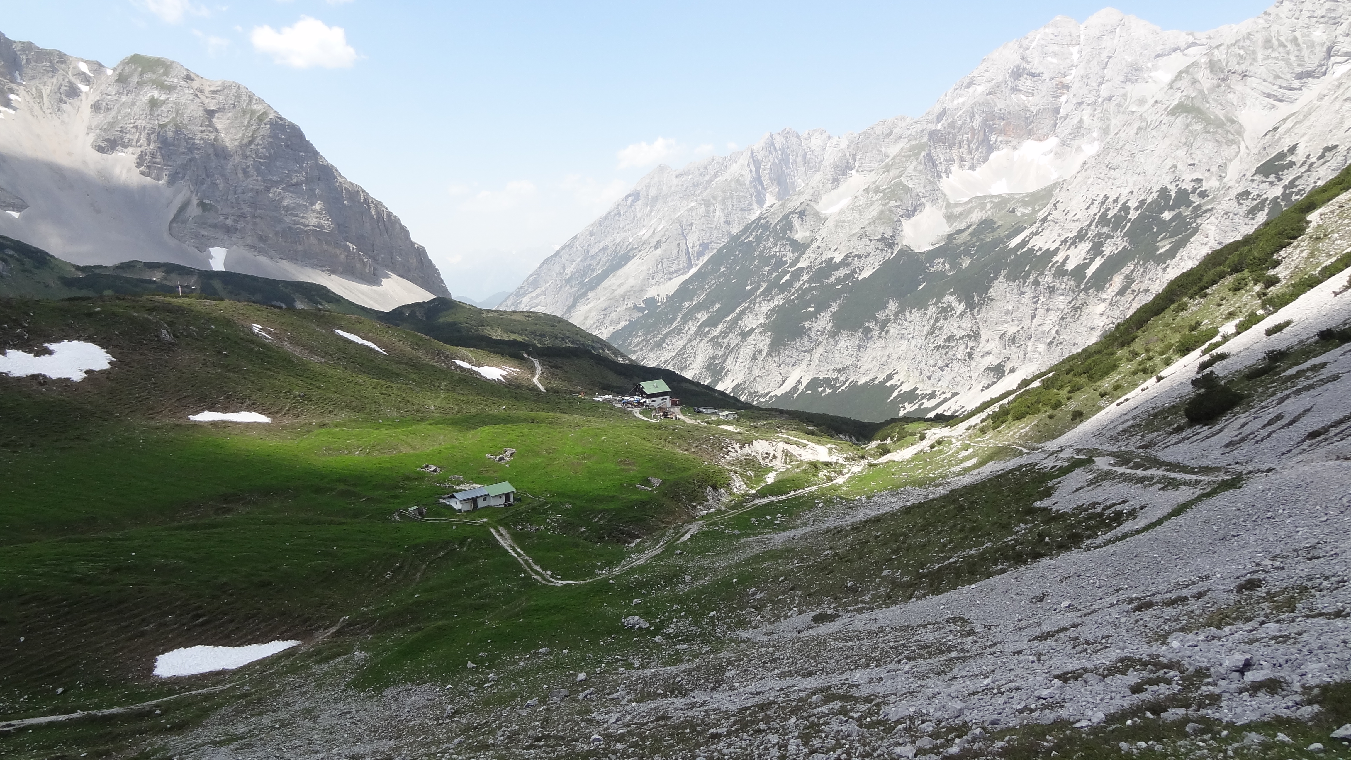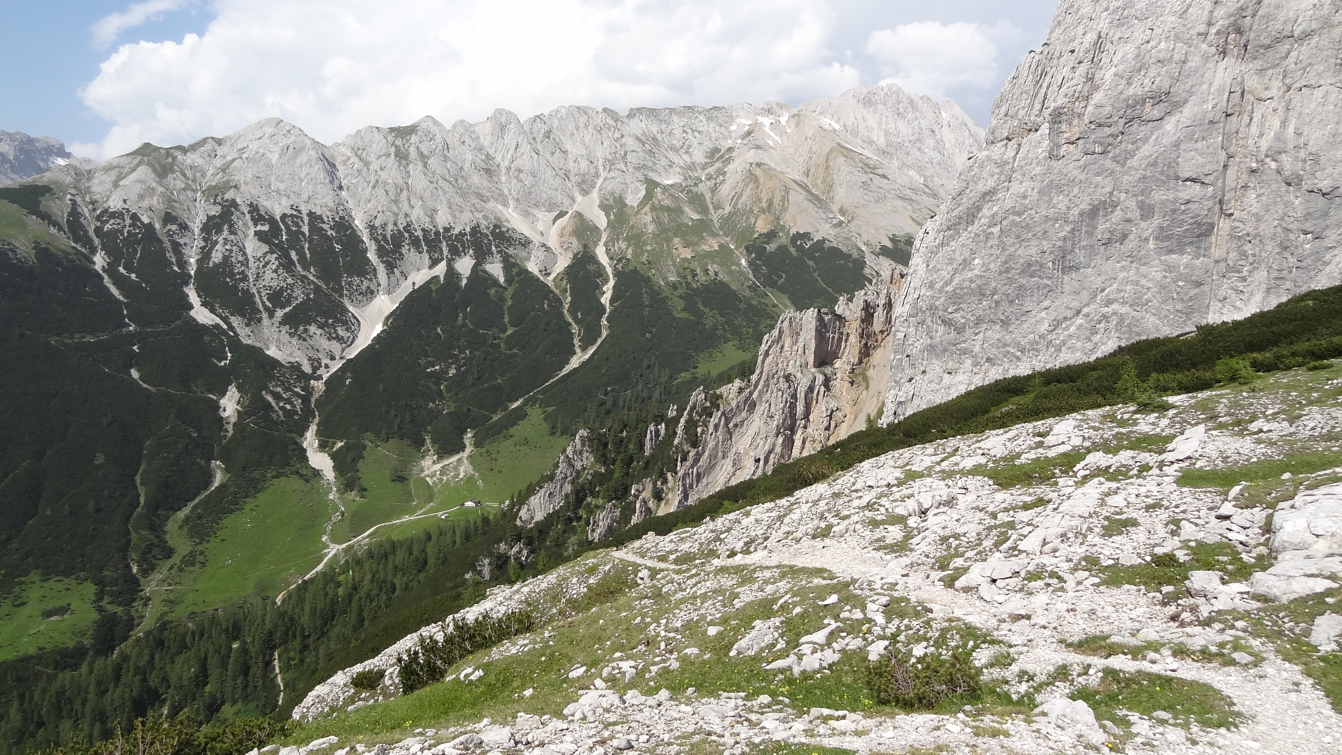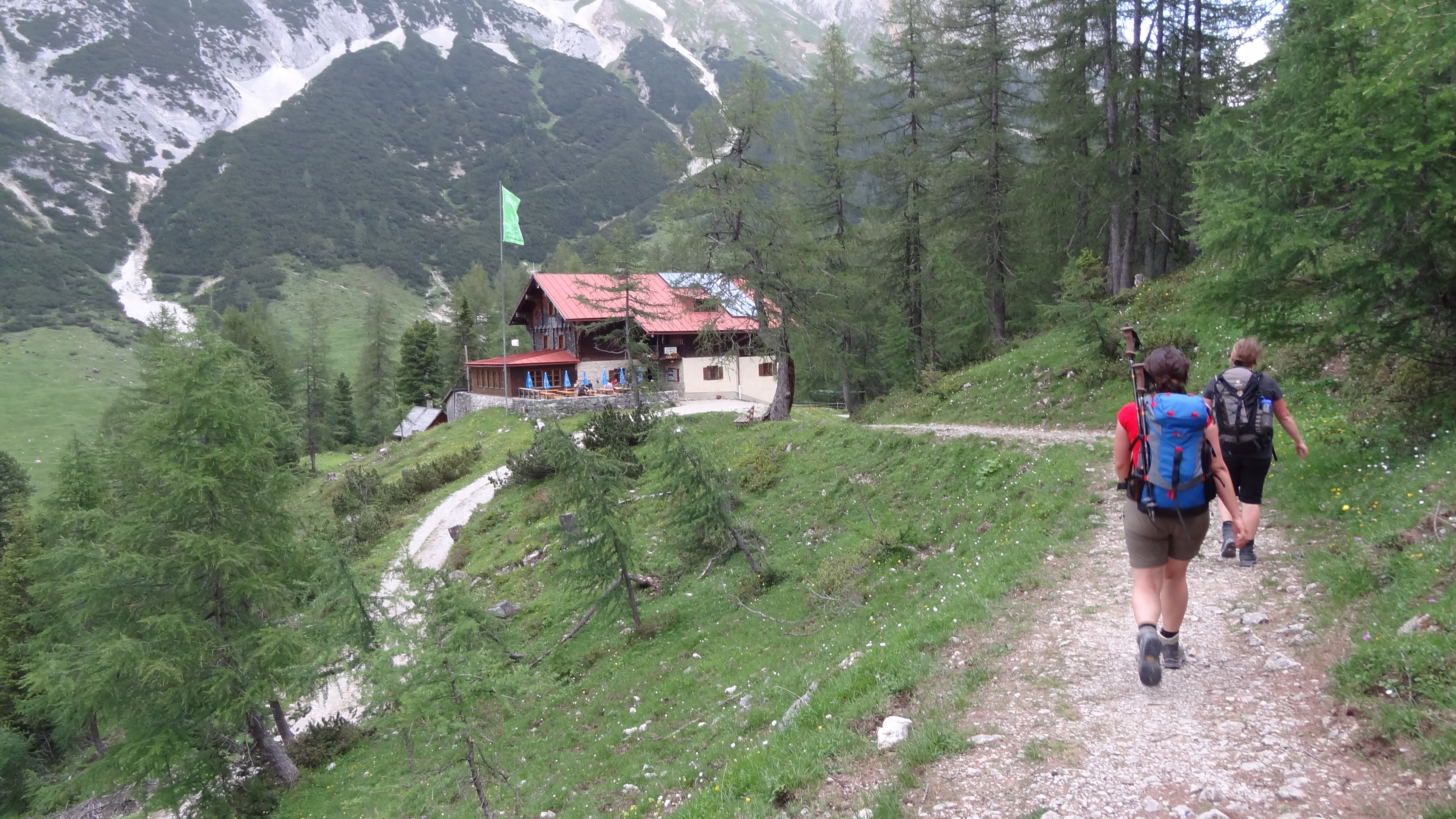 We set out after a very nice breakfast of the usual mountain fare, and headed for a pass which would ultimately take us down a steep scree path, from about 2,250m to the valley floor just outside Innsbruck at around 700m or so.
