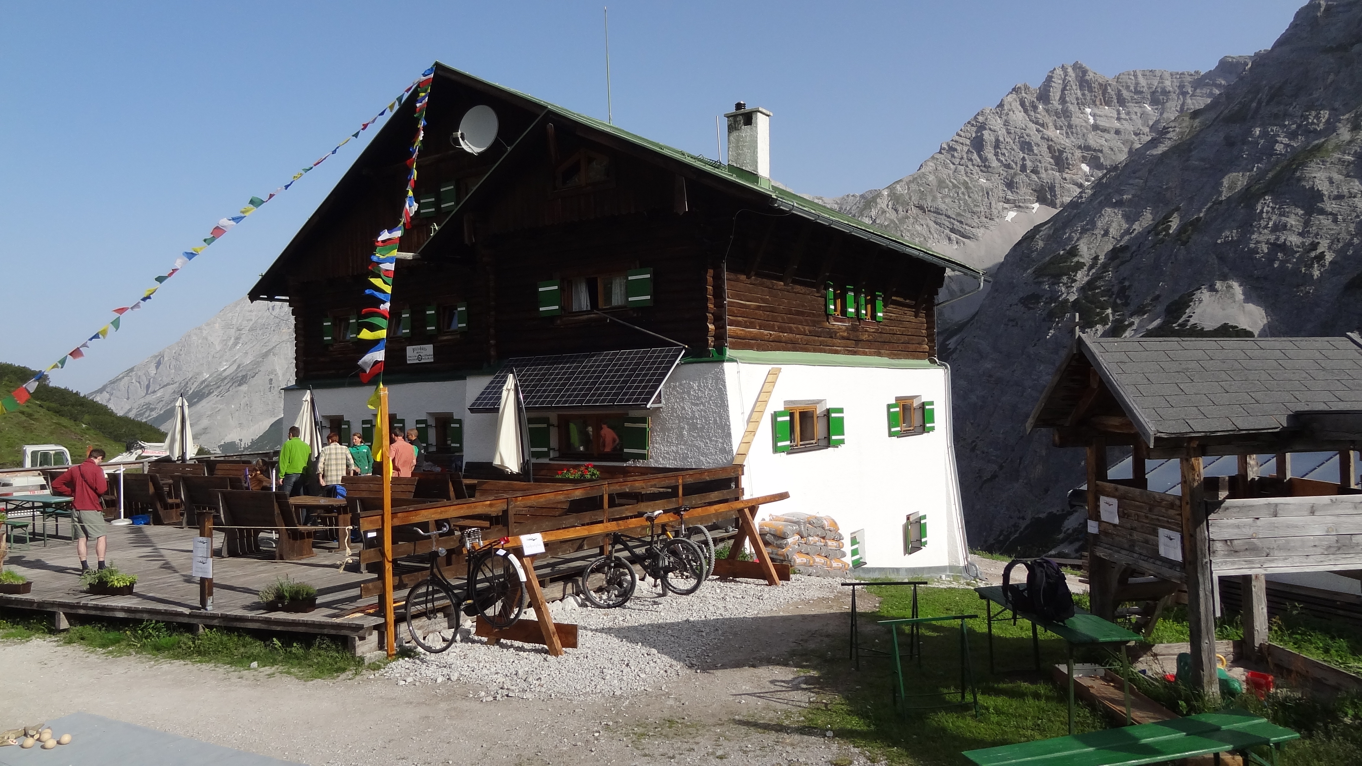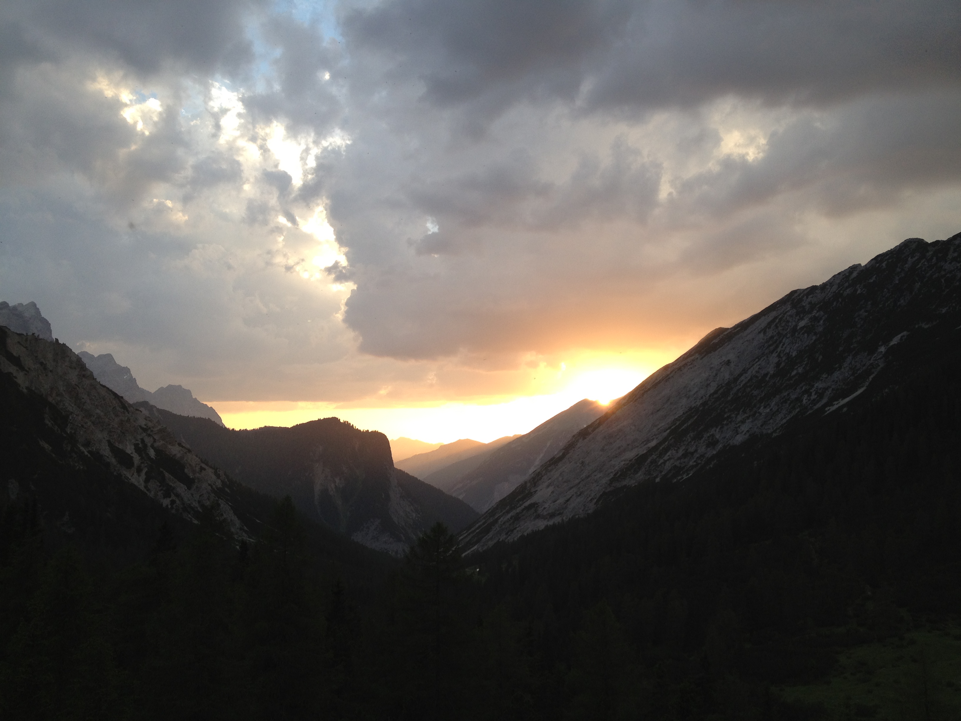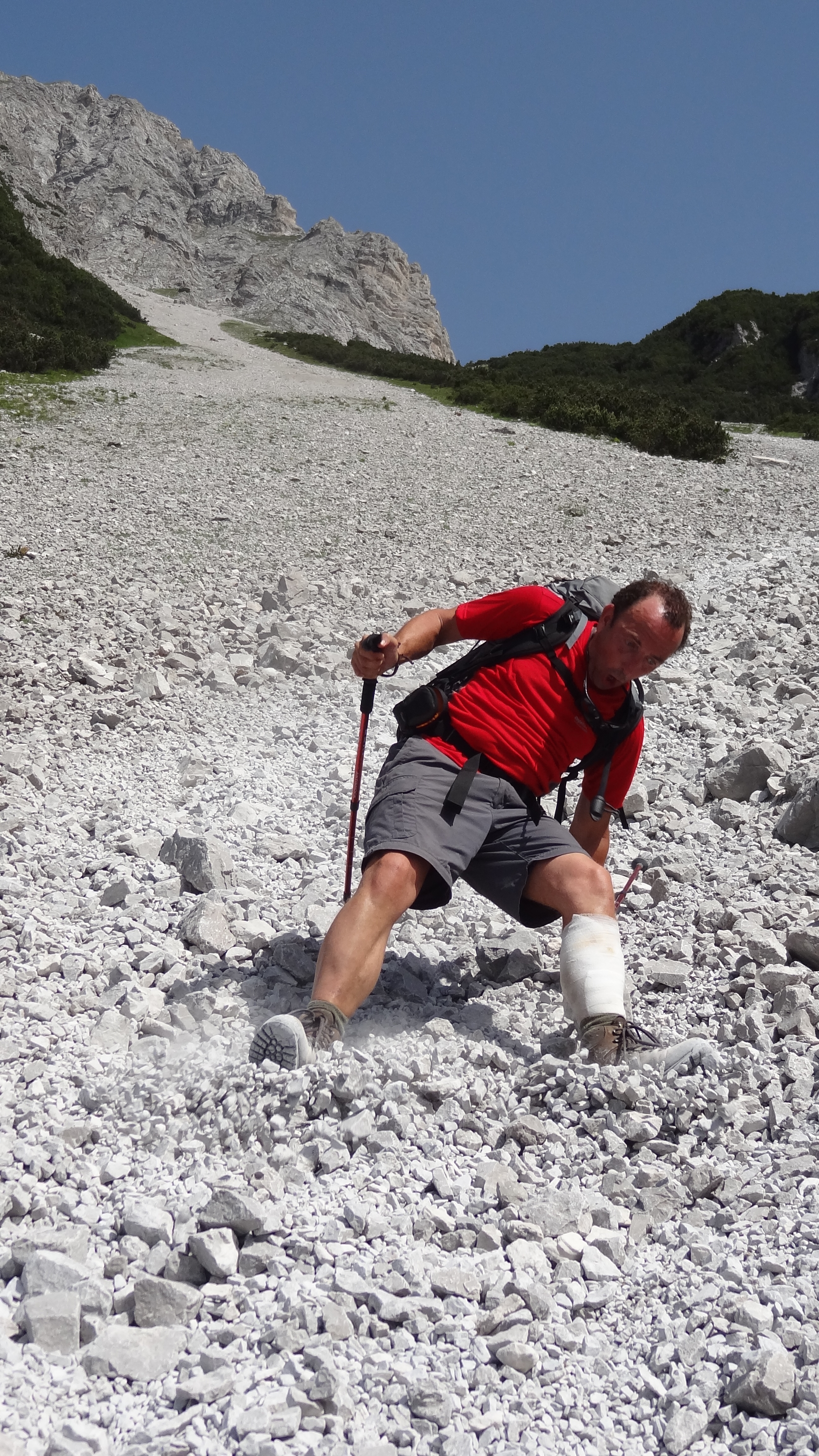 The final day in the mountains saw us waking up in the Pfeishutte in Austria, which is almost due north of Innsbruck. The Pfieshutte sits at about 2,000m, and was very busy. We were in the uppermost dormitory, in a room meant for (I think) 10, and I reckon there were probably 14 in there, which made it a little cosy. Thankfully I had what approximates to a single bed, the only one I have ever seen in any mountain hut, and since I was waking up with my leg strapped up from yesterday’s fall, I was very grateful to be in it.