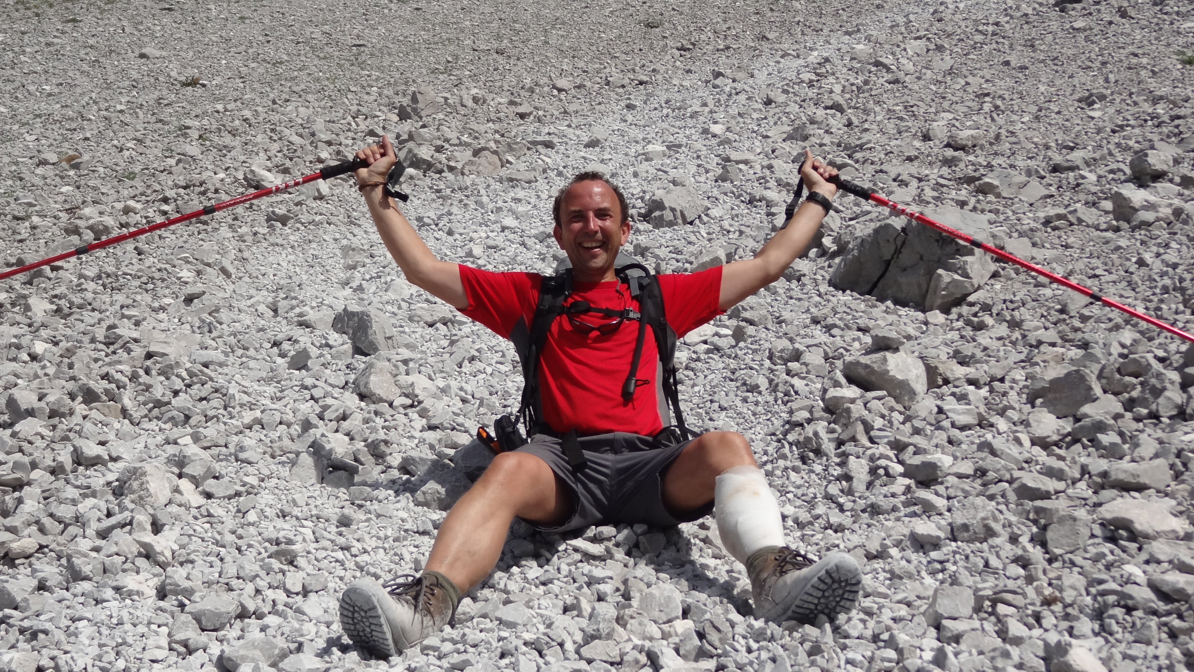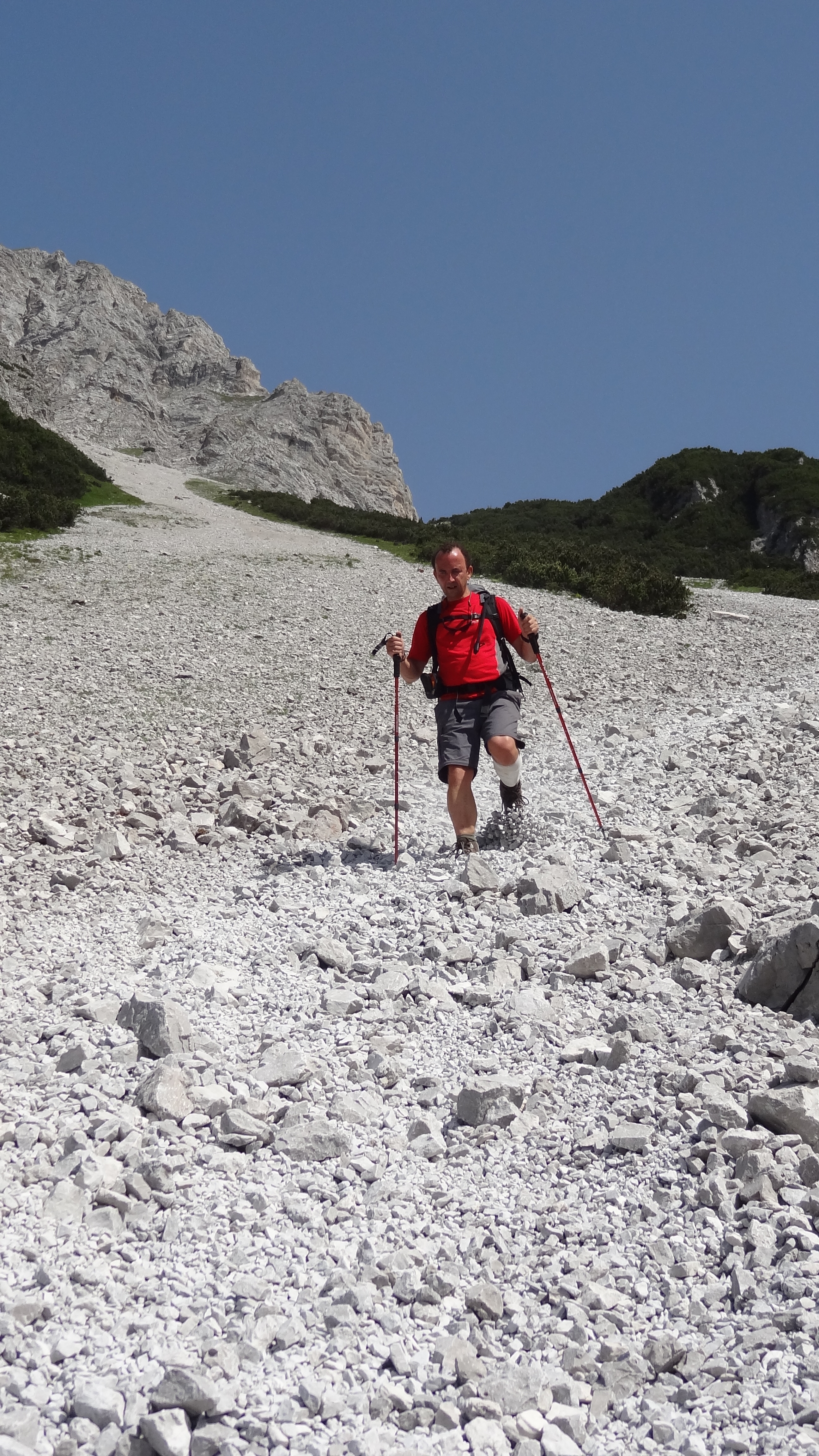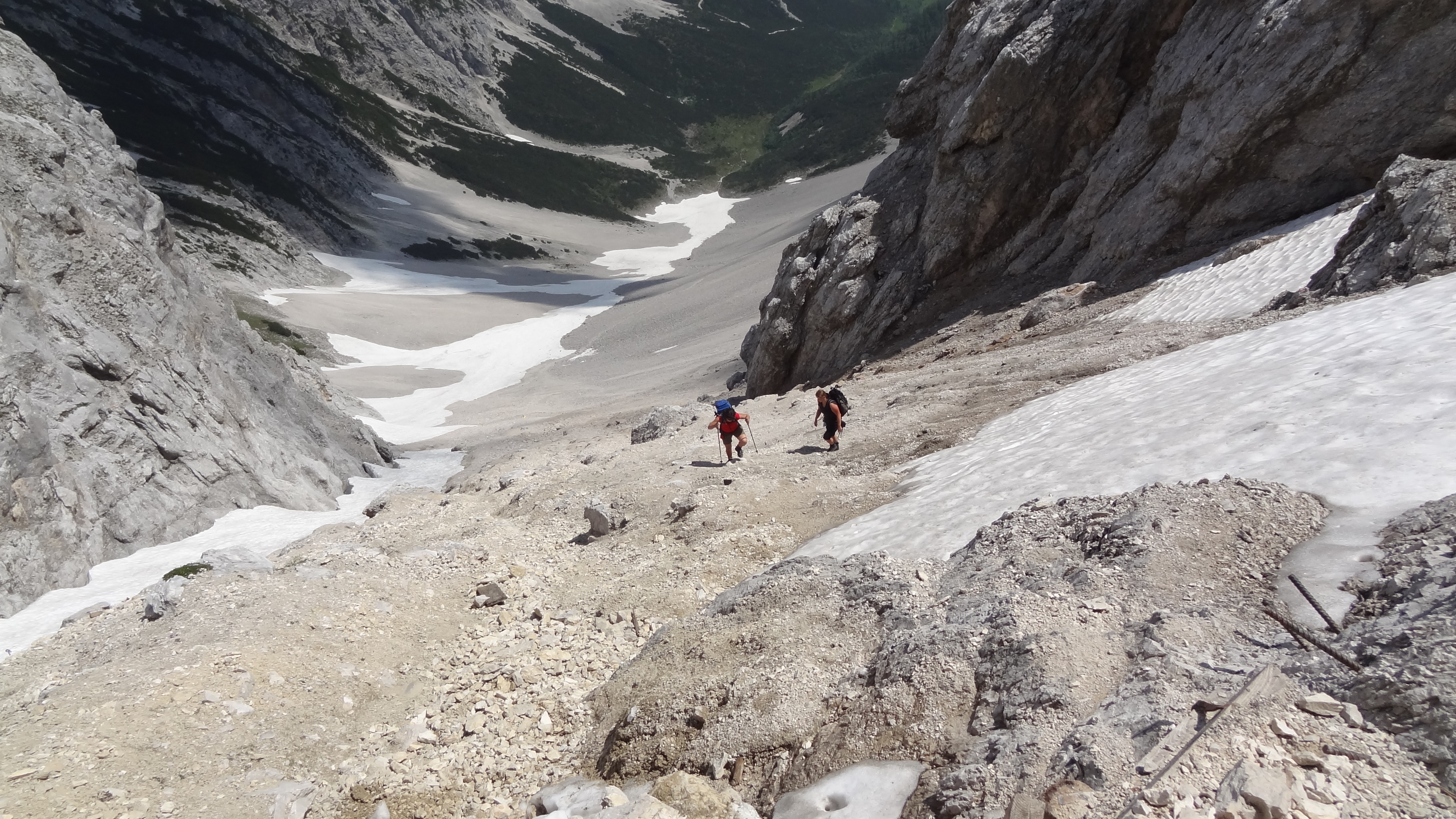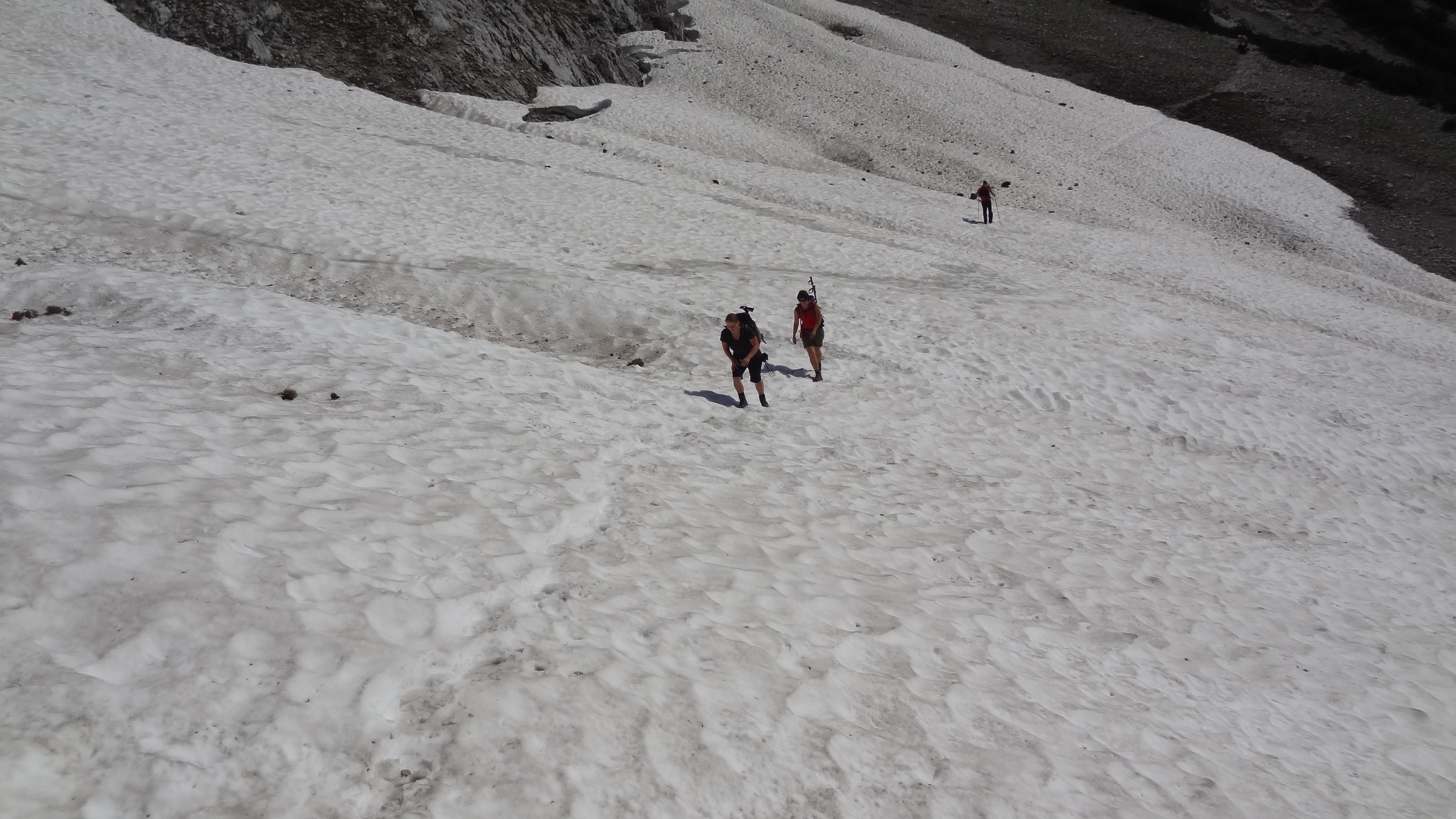 The final day in the mountains saw us waking up in the Pfeishutte in Austria, which is almost due north of Innsbruck. The Pfieshutte sits at about 2,000m, and was very busy. We were in the uppermost dormitory, in a room meant for (I think) 10, and I reckon there were probably 14 in there, which made it a little cosy. Thankfully I had what approximates to a single bed, the only one I have ever seen in any mountain hut, and since I was waking up with my leg strapped up from yesterday’s fall, I was very grateful to be in it.
