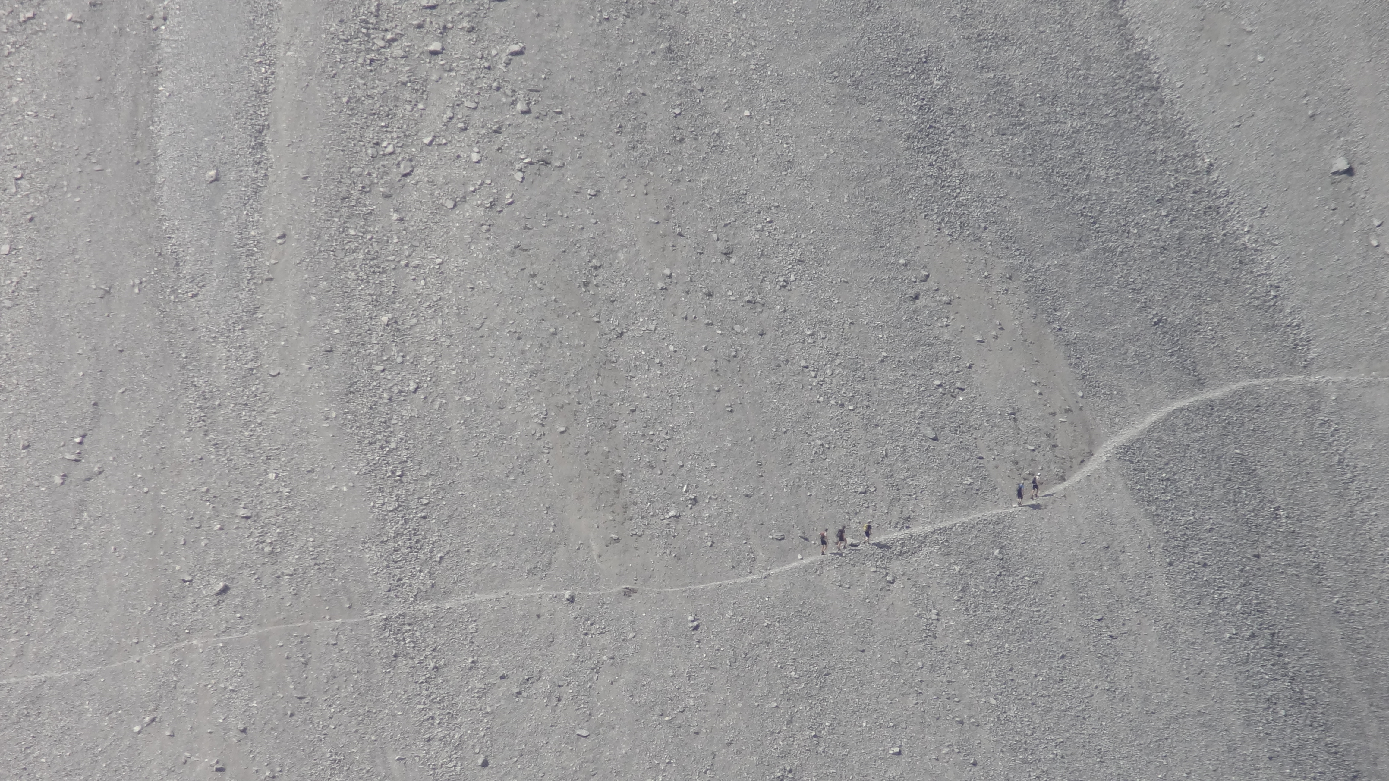 After a while of sort of stumbling down the hill and wondering how long it would take, we were passed at great speed by a couple who were scree-skiing. The penny then dropped that this was really about the only way to get down, and certainly quicker, and probably just as safe, so we went for it.