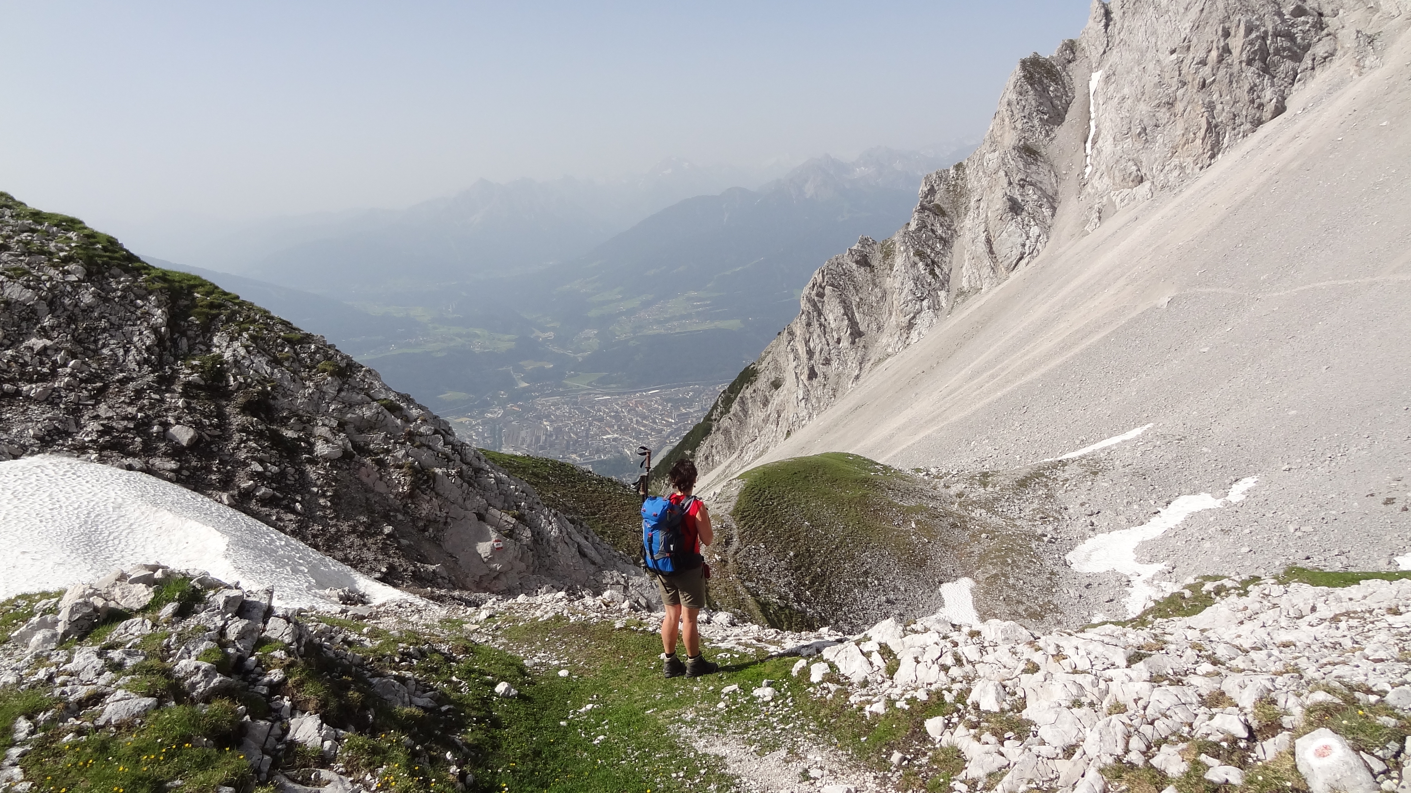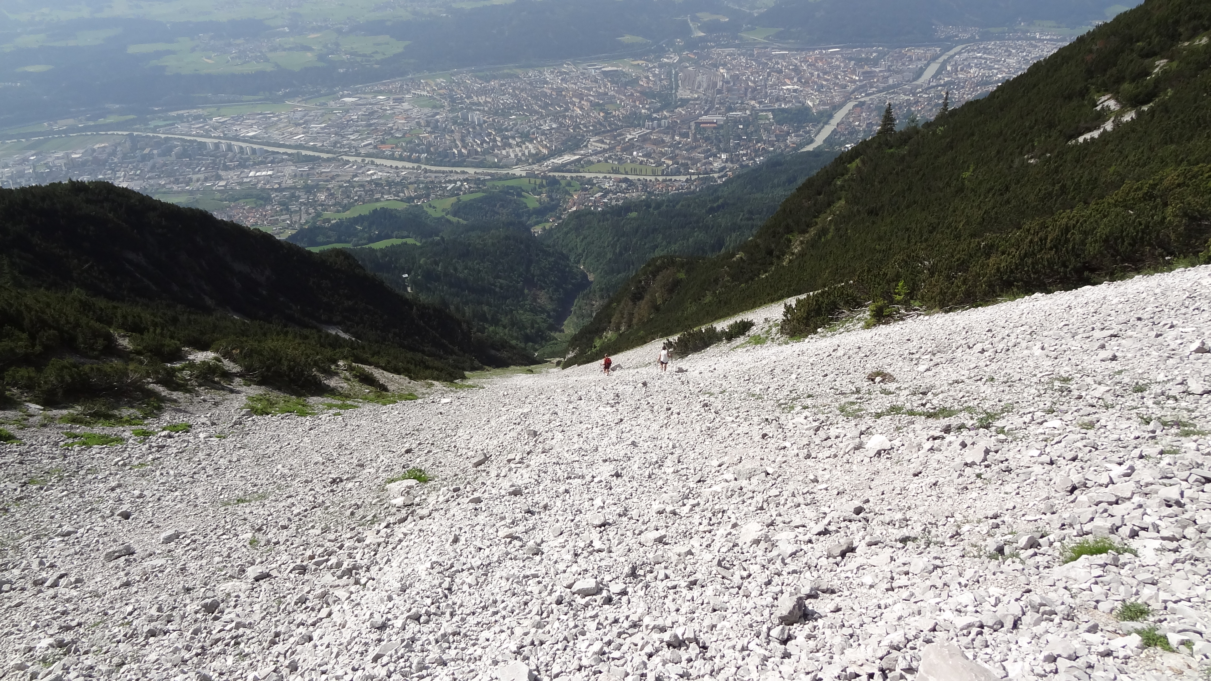 We then came to the start of the descent. The path was essentially just scree, and very steep. It was hard not to slide on almost every step, which made the heat seem even worse. It was also hard not to look at the view of Innsbruck and the Alps south of there, which totally dominated every view.
